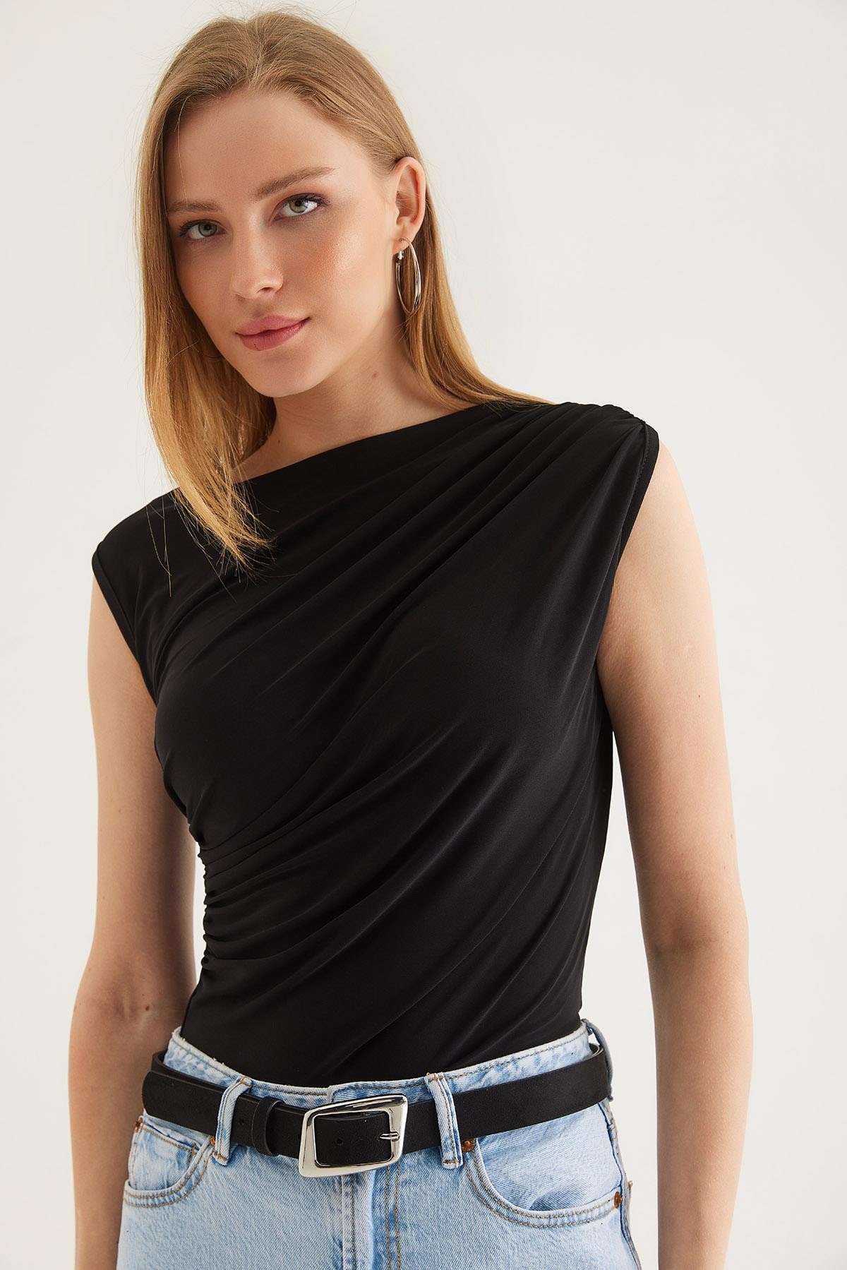 Çapraz Büzgü Detaylı Kolsuz Bluz Siyah (250463BLZXSYH)