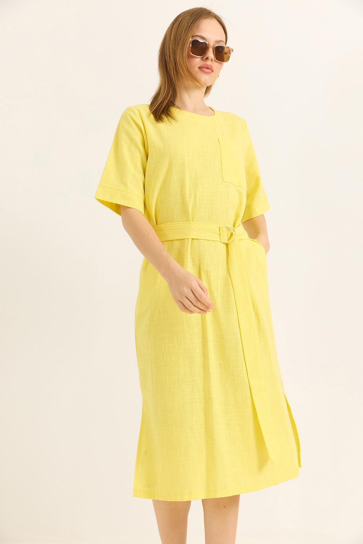 Cepli Kemer Detaylı Yırtmaçlı Dokuma Keten Elbise Sarı (500155ELBXSRI)
