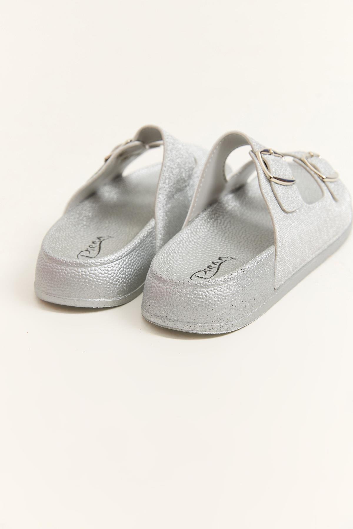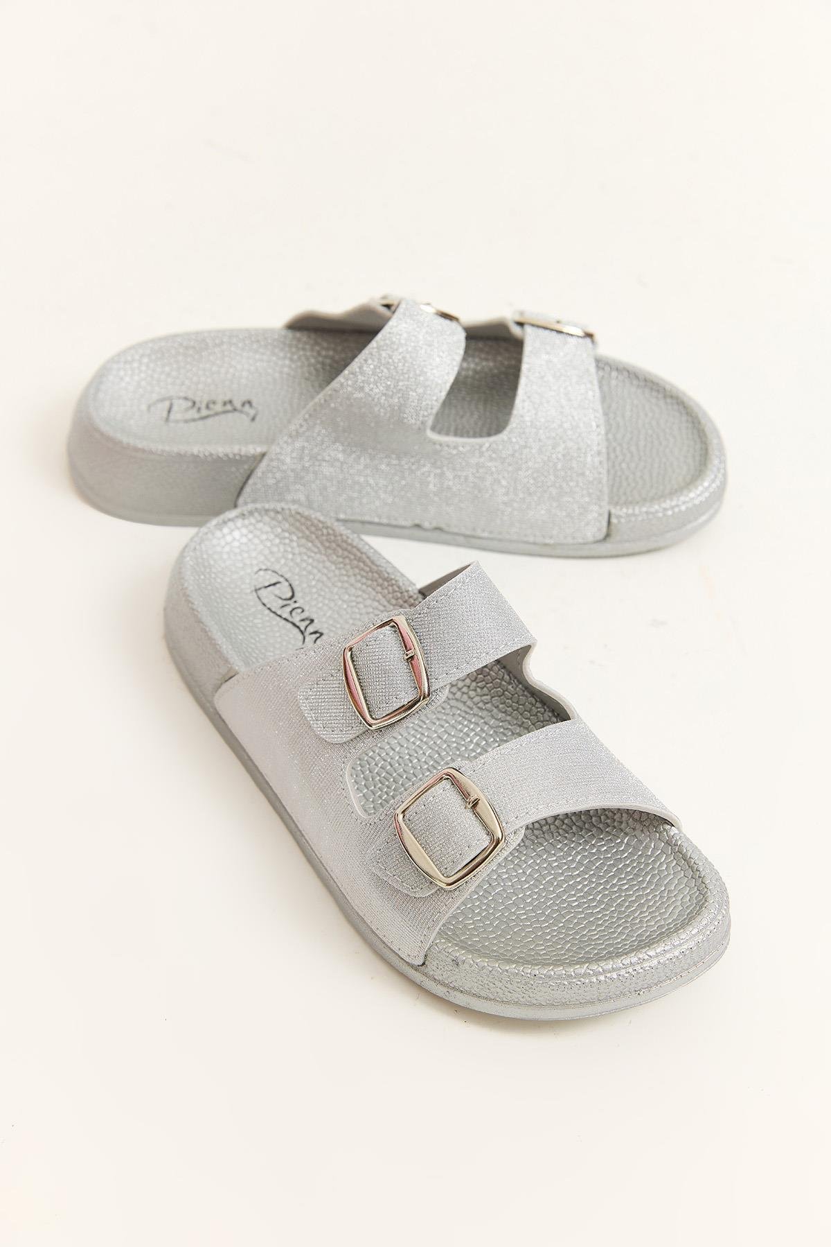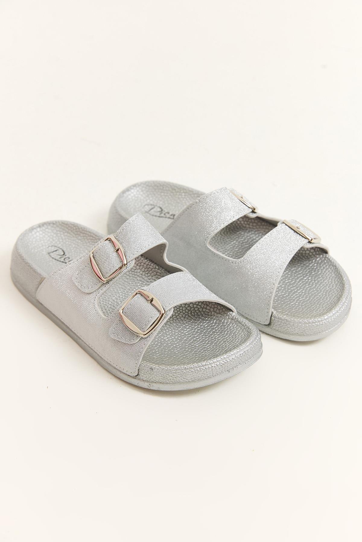 Çift Bant Tokalı Rahat Taban Terlik Gümüş (252047TRLXGMS)