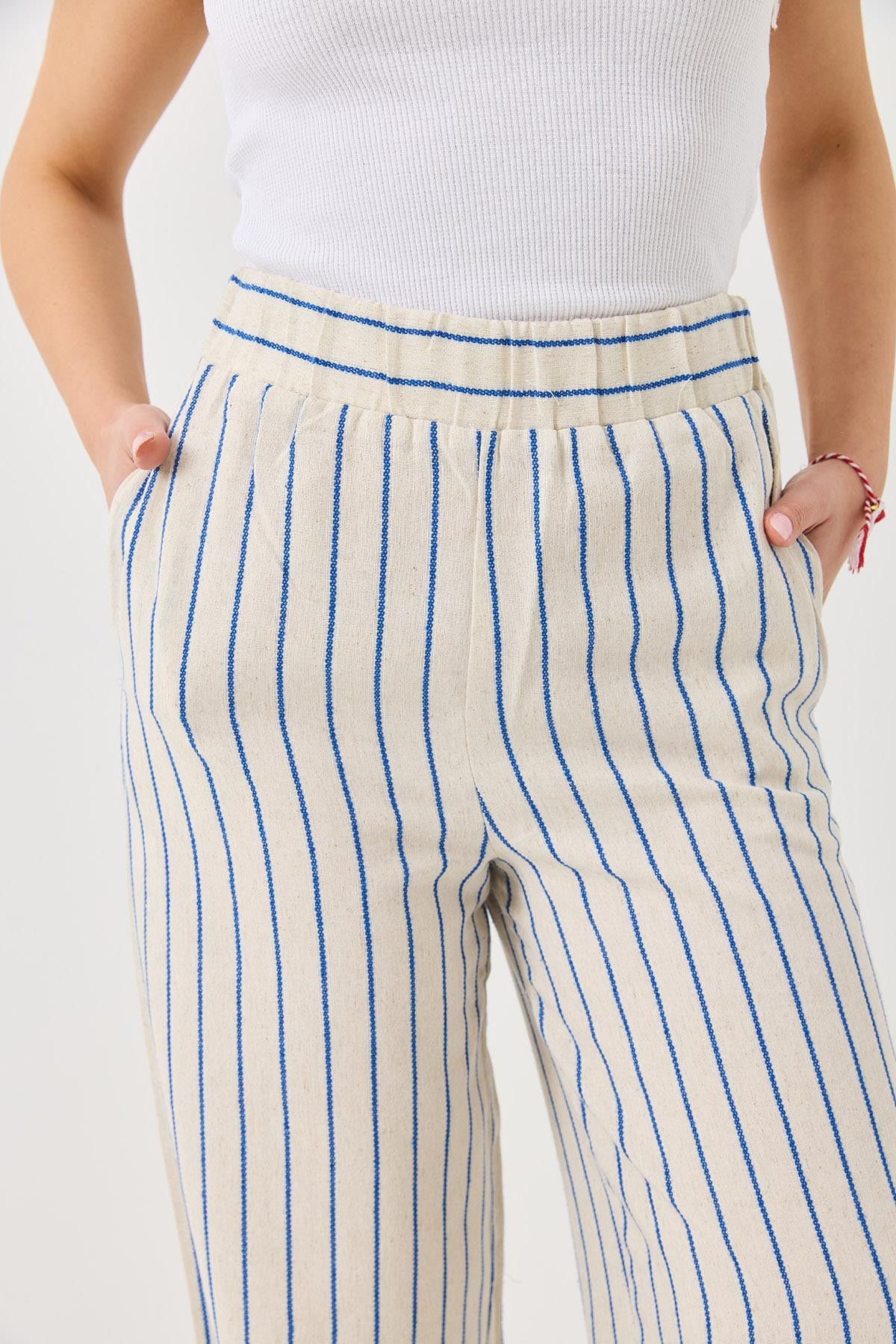 Çizgi Desenli Bol Paçalı Keten Pantolon Mavi (250584PNTXMVİ)