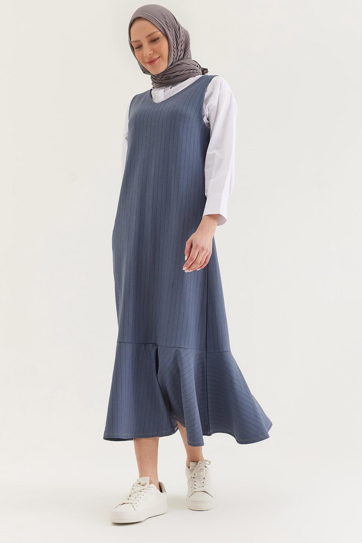 Çizgili Sıfır Kol Beli Kuşaklı Elbise