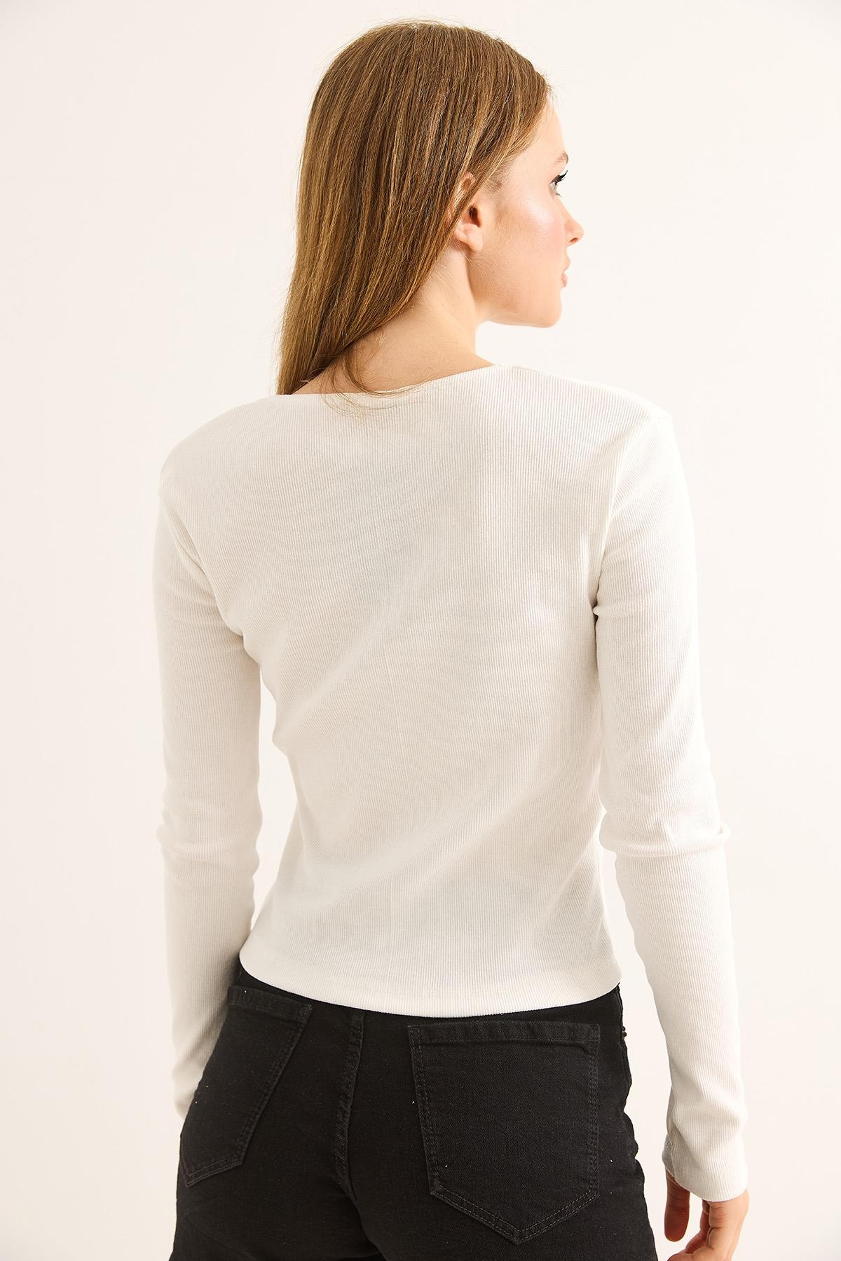 Dantel Detaylı Fitilli Uzun Kollu Bluz Beyaz