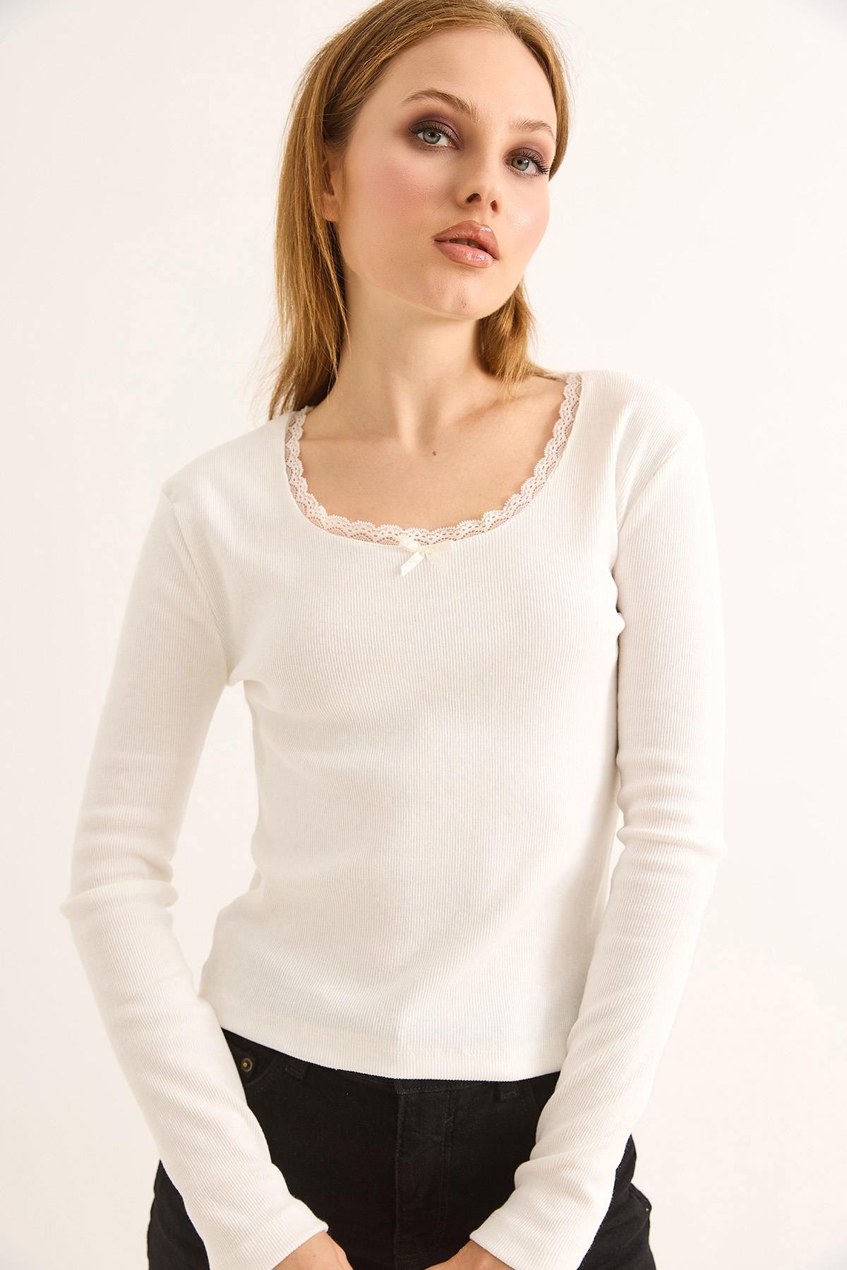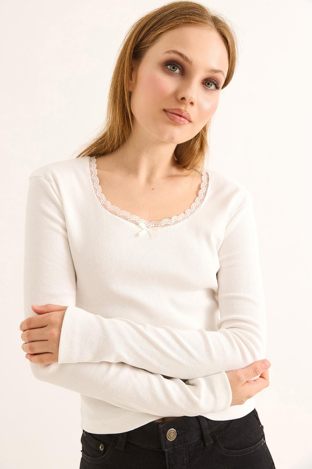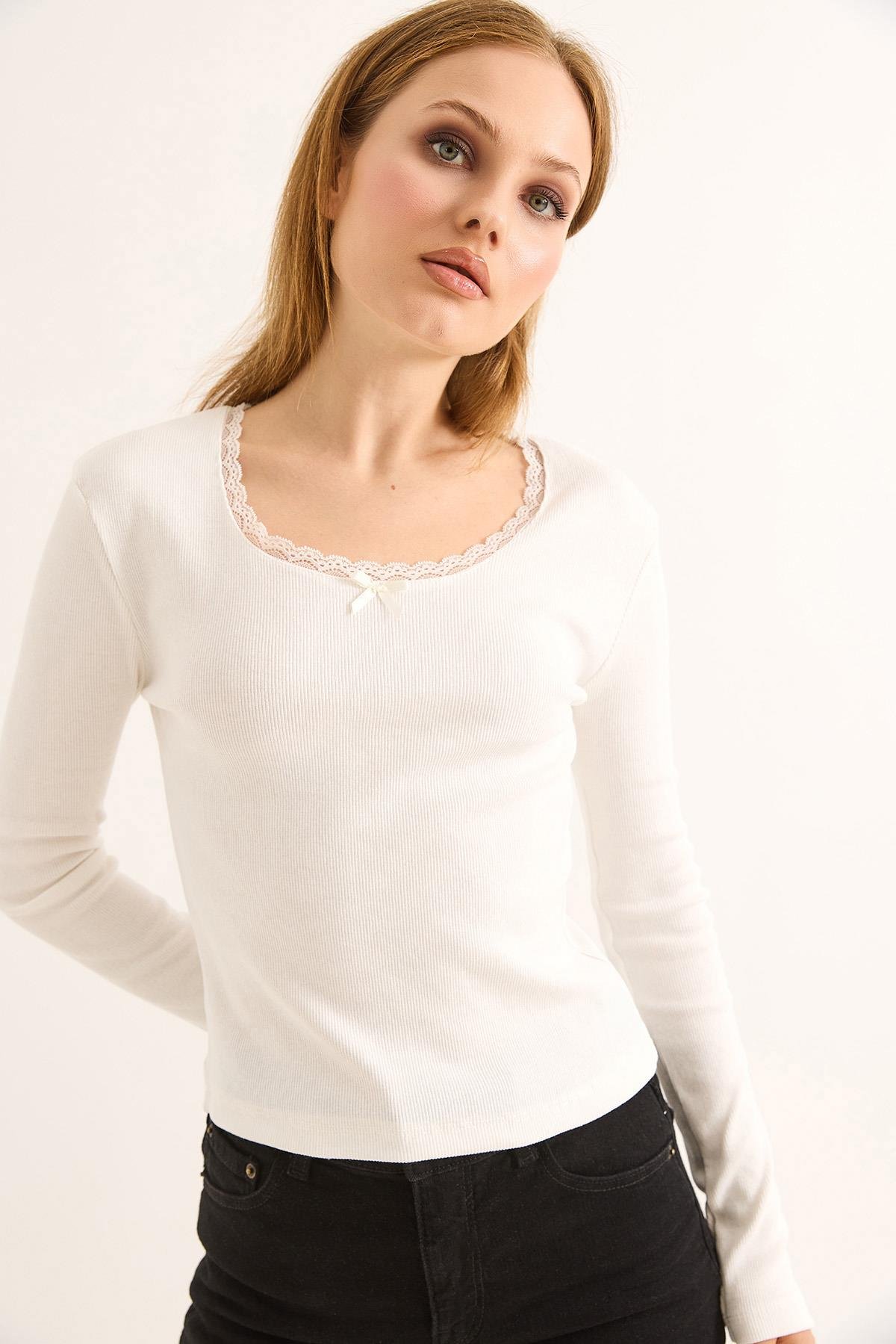 Dantel Detaylı Fitilli Uzun Kollu Bluz Beyaz (251080BLZXBYZ)