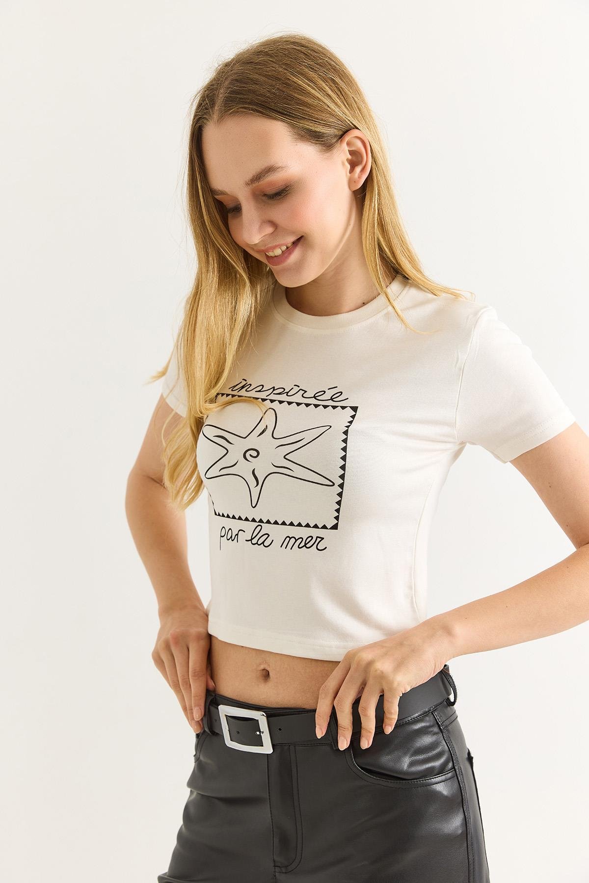Deniz Yıldızı Baskılı Bisiklet Yaka Crop Beyaz (500292BLZXBYZ)