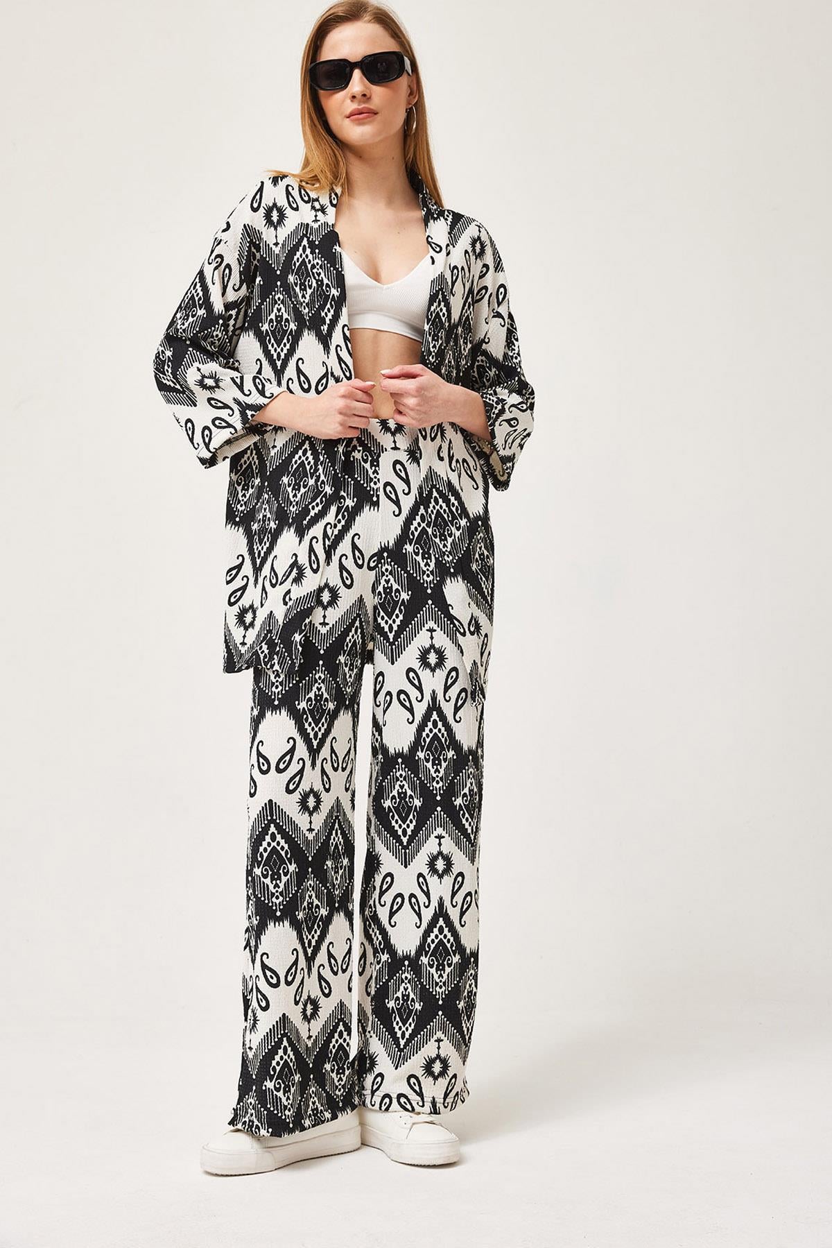 Desenli Krinkıl Kimono Pantolon İkili Takım Siyah (250372TKMXSYH)