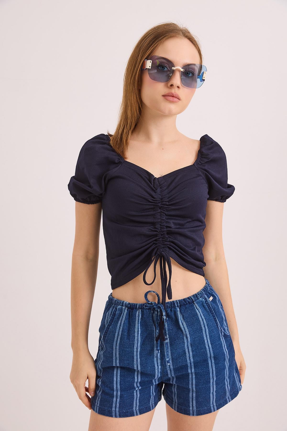 Desenli Prenses Kol Önden Büzgülü Bluz Lacivert (250860BLZXLACİ2)