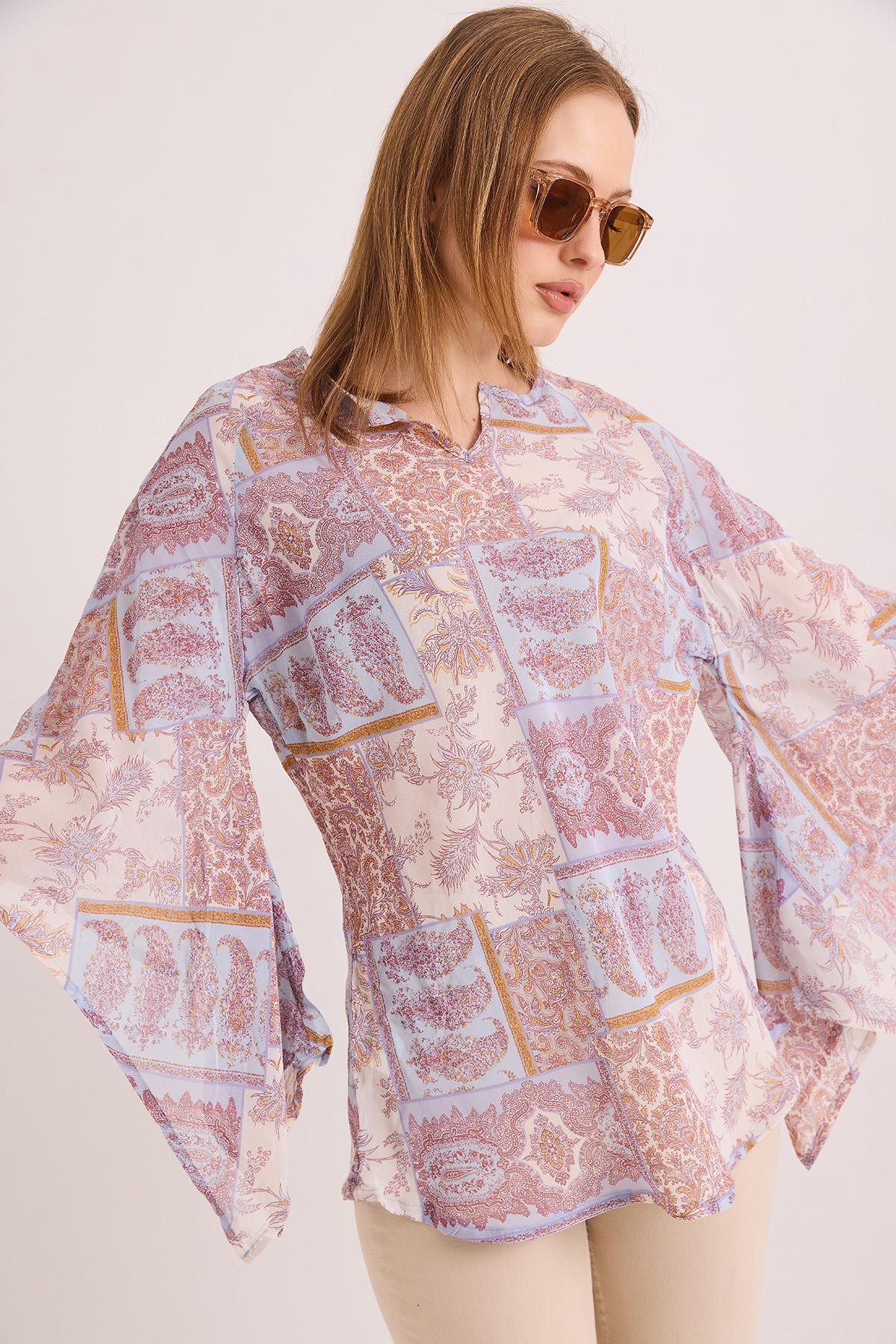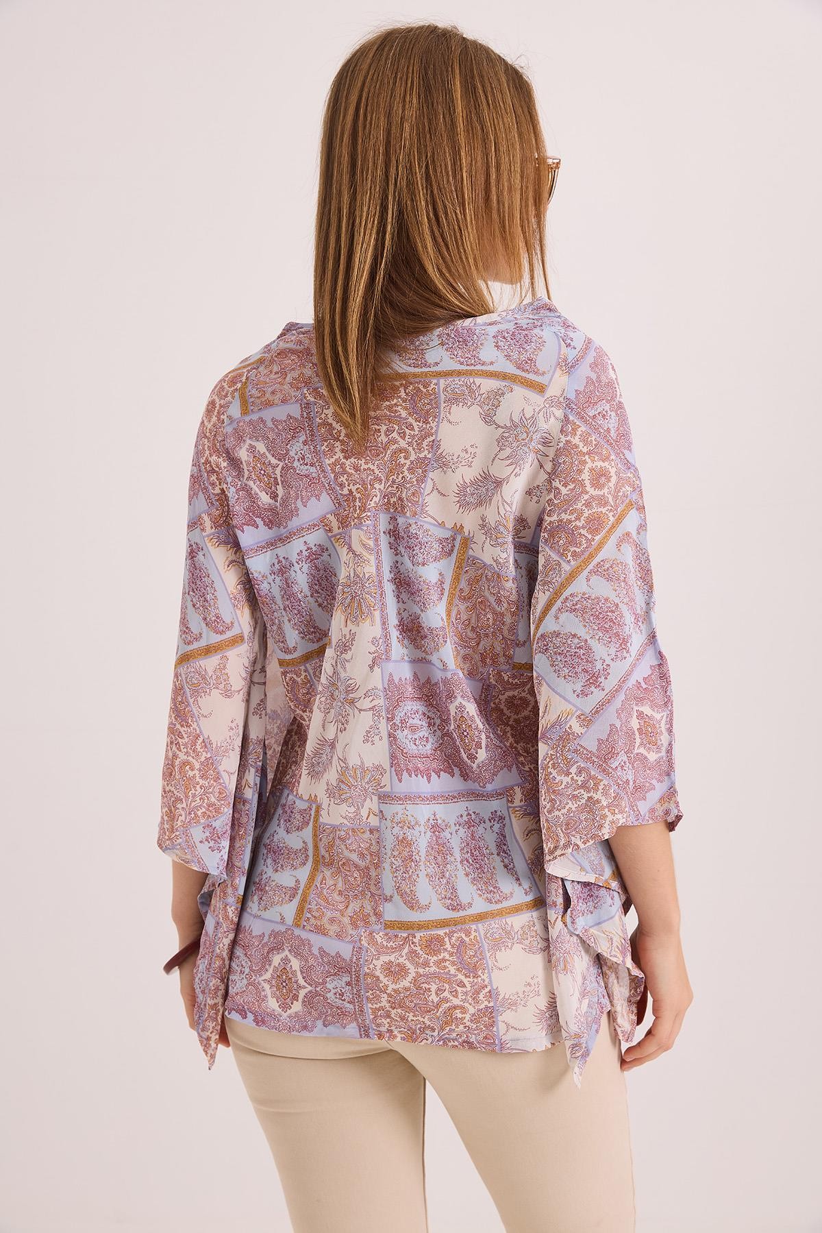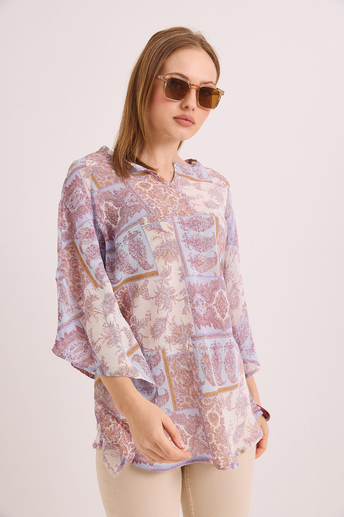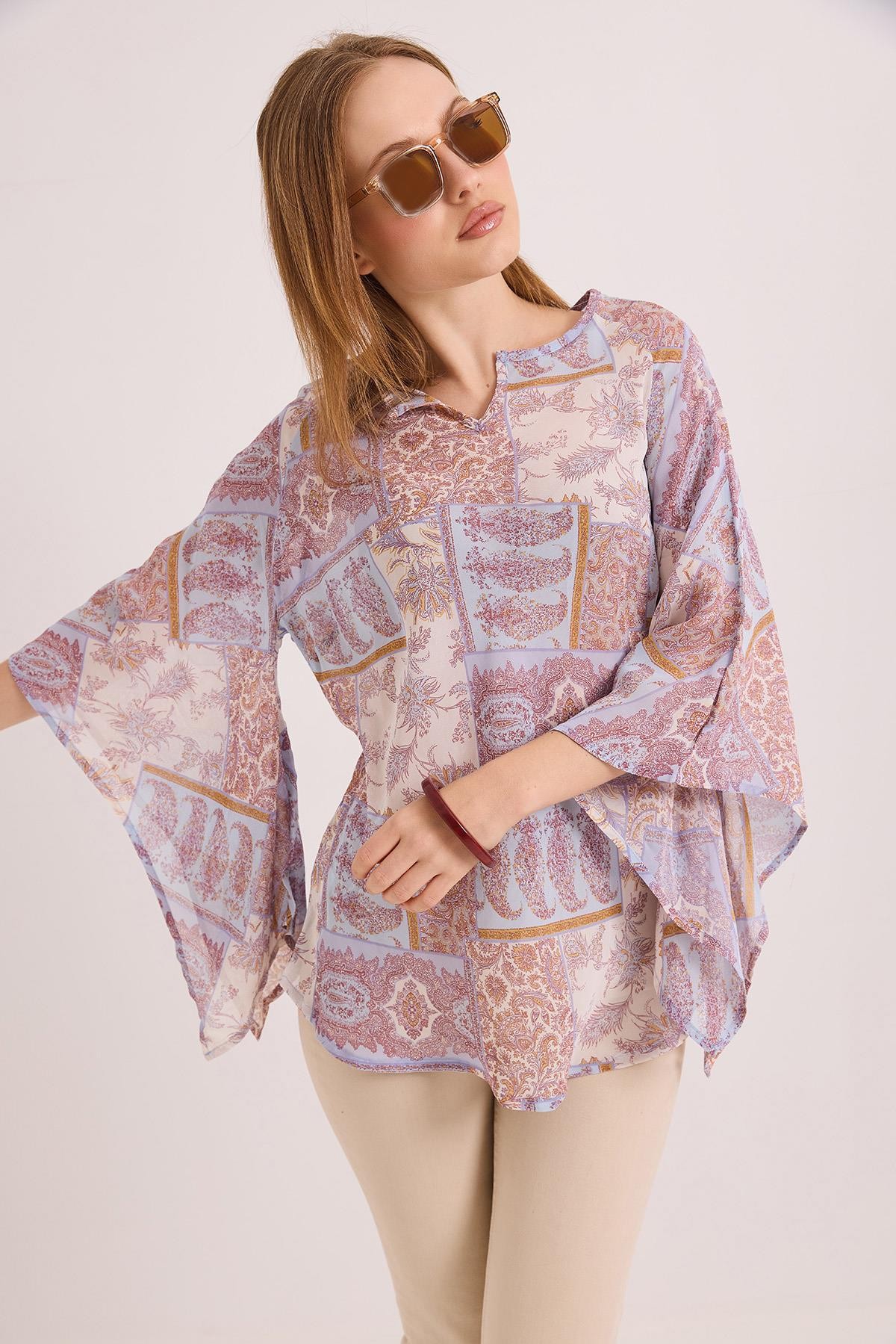 Desenli Yarasa Kol V Yaka Salaş Şifon Bluz Lila (250866BLZXLLA)