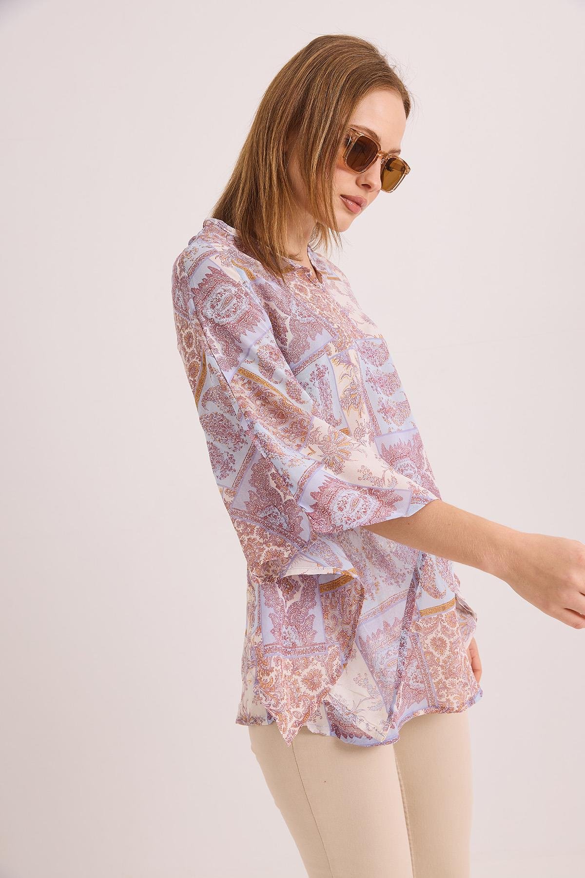 Desenli Yarasa Kol V Yaka Salaş Şifon Bluz Lila
