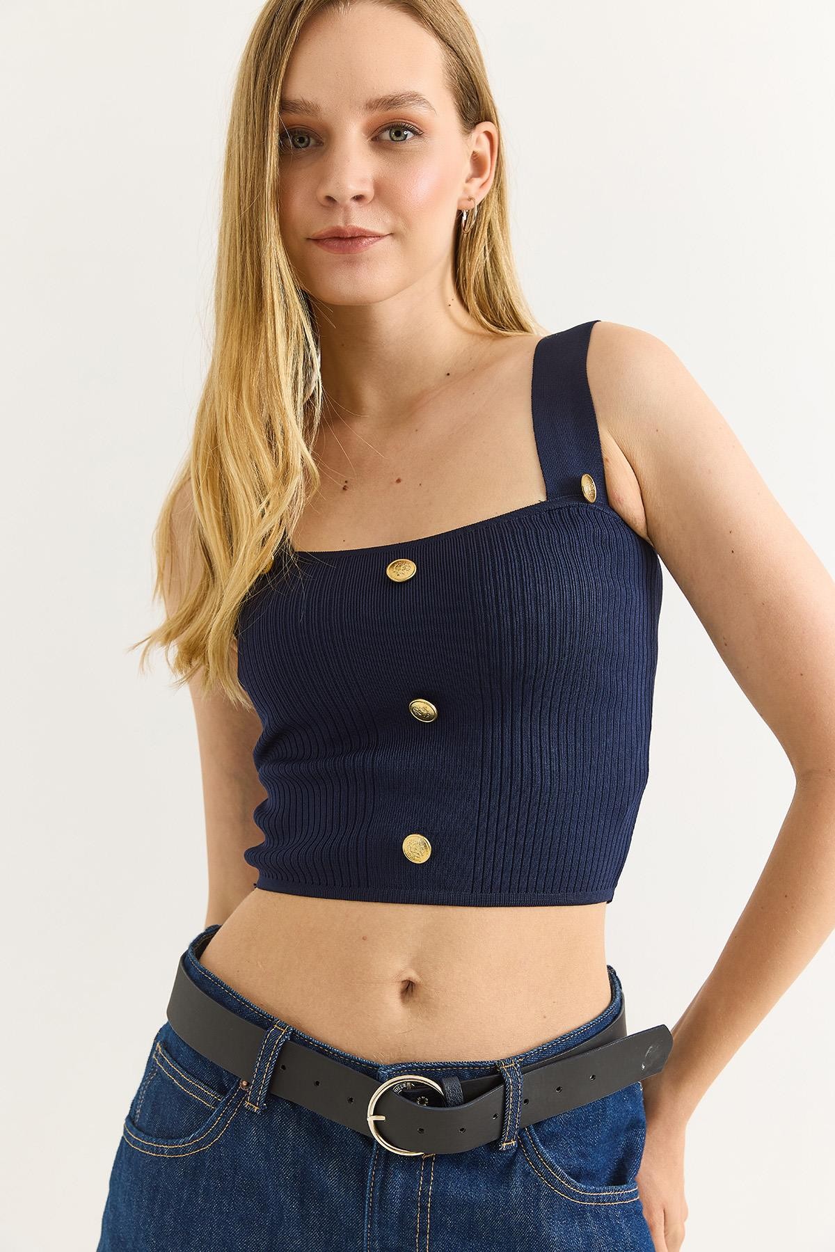 Düğme Aksesuarlı Askılı Triko Crop Bluz Lacivert (250029BLZXLCV)