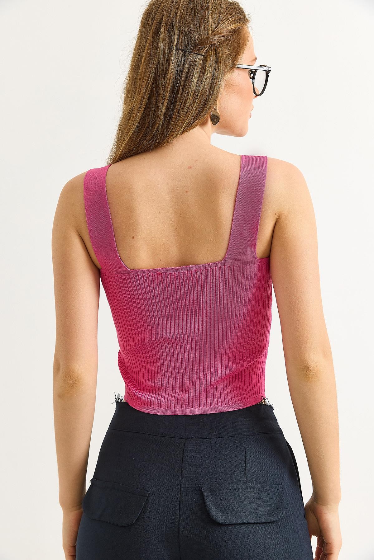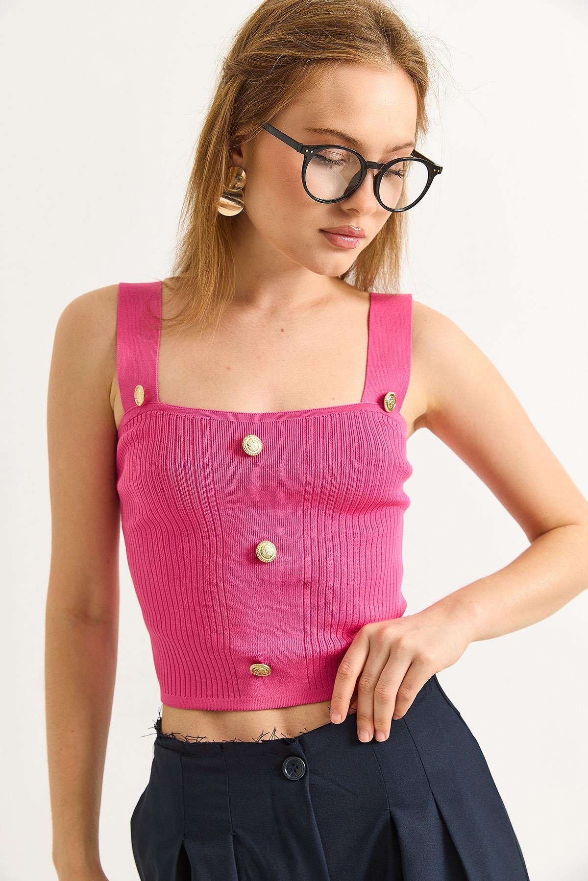 Düğme Aksesuarlı Askılı Triko Crop Bluz Pembe (251029BLZXPMB)