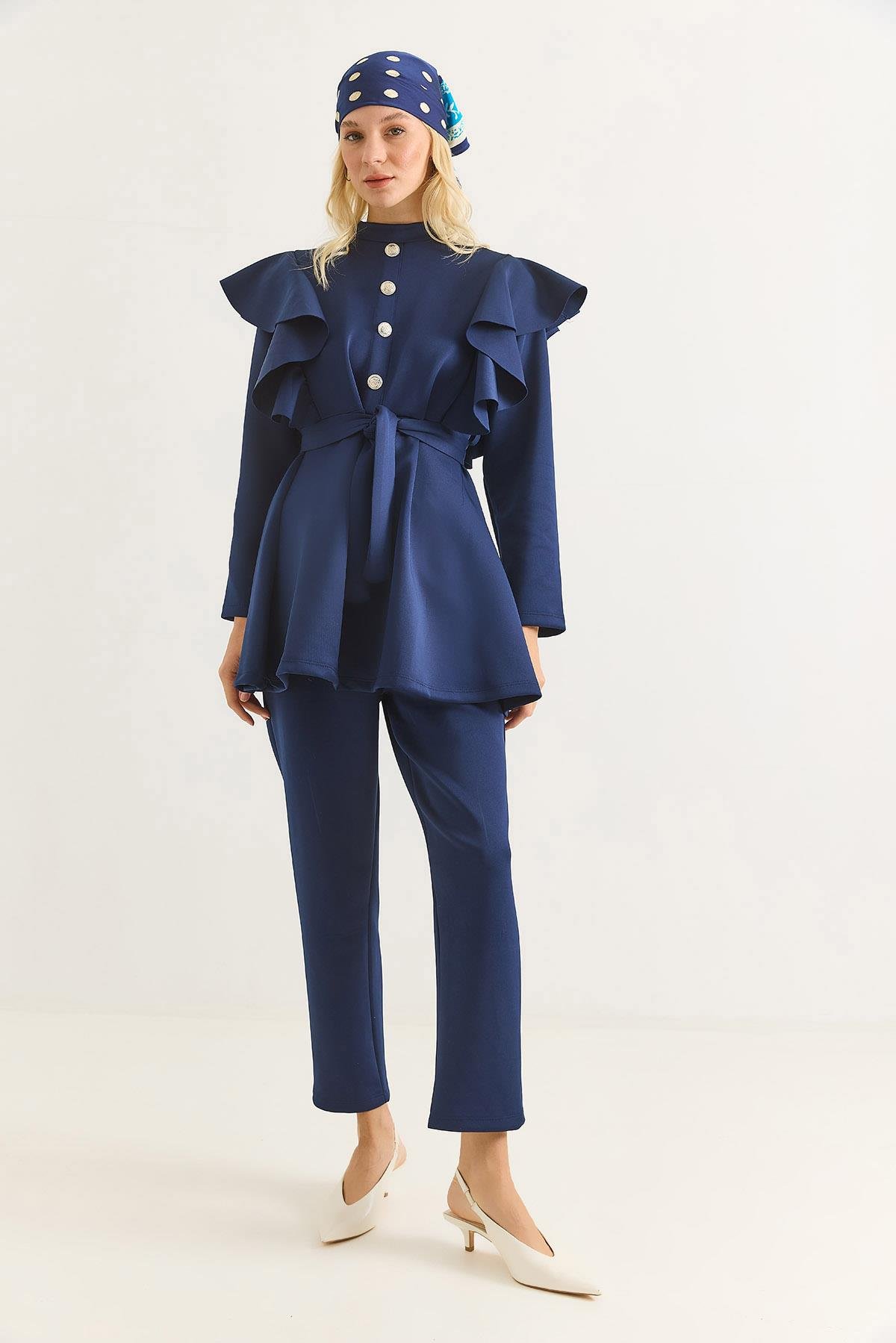 Düğme Detaylı Dik Yaka Omuzu Fırfırlı Scuba Takım Lacivert