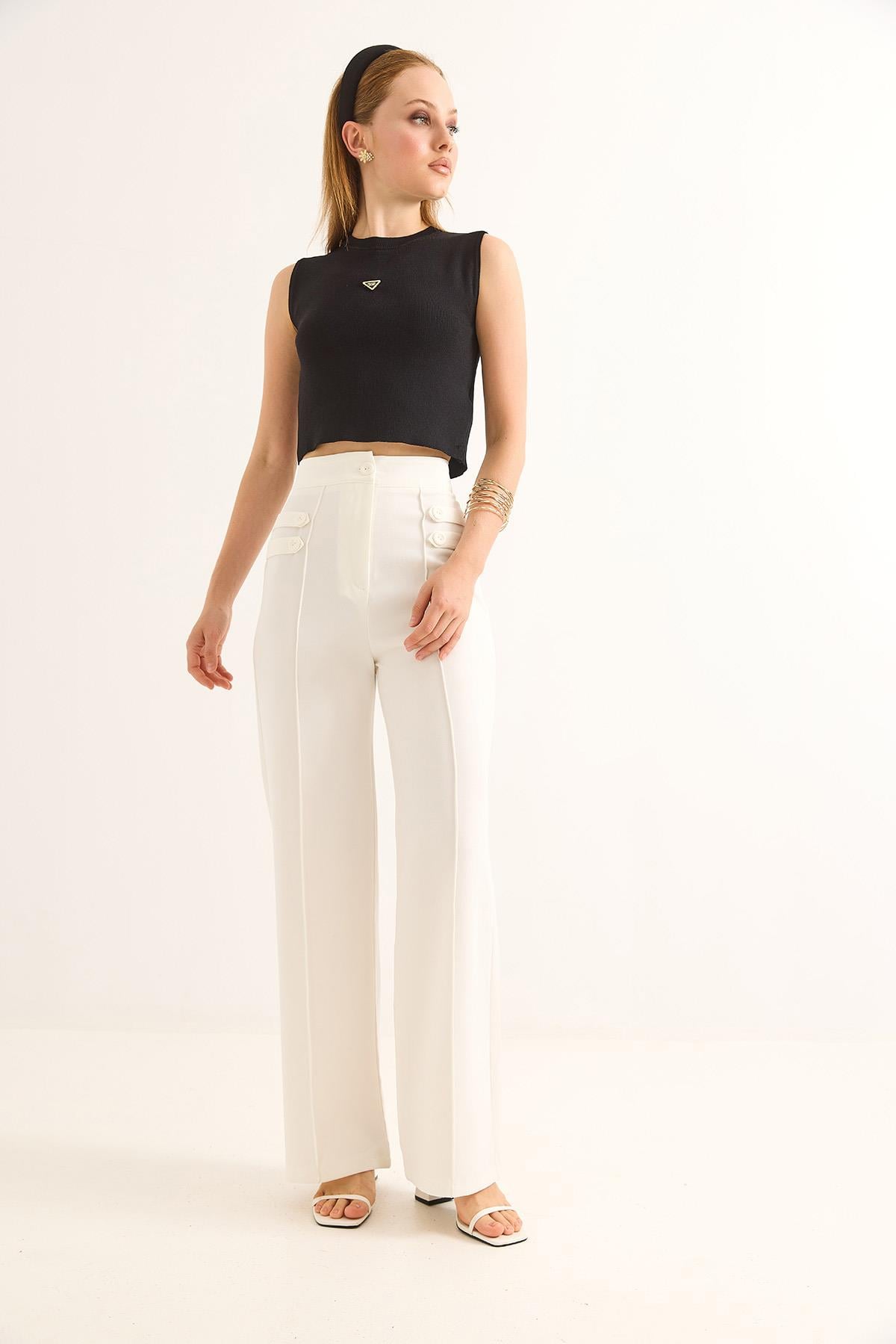 Düğme Detaylı Yüksel Bel Bol Paça Pantolon Beyaz (251088PNTXBYZ)