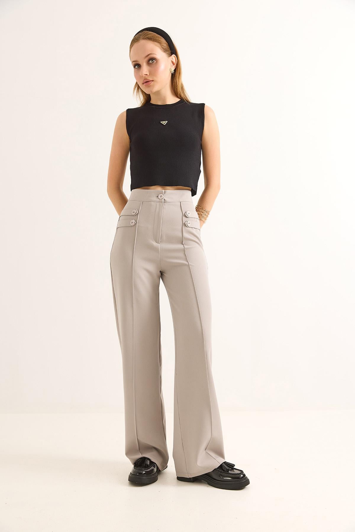 Düğme Detaylı Yüksel Bel Bol Paça Pantolon Gri (251088PNTXGRİ)