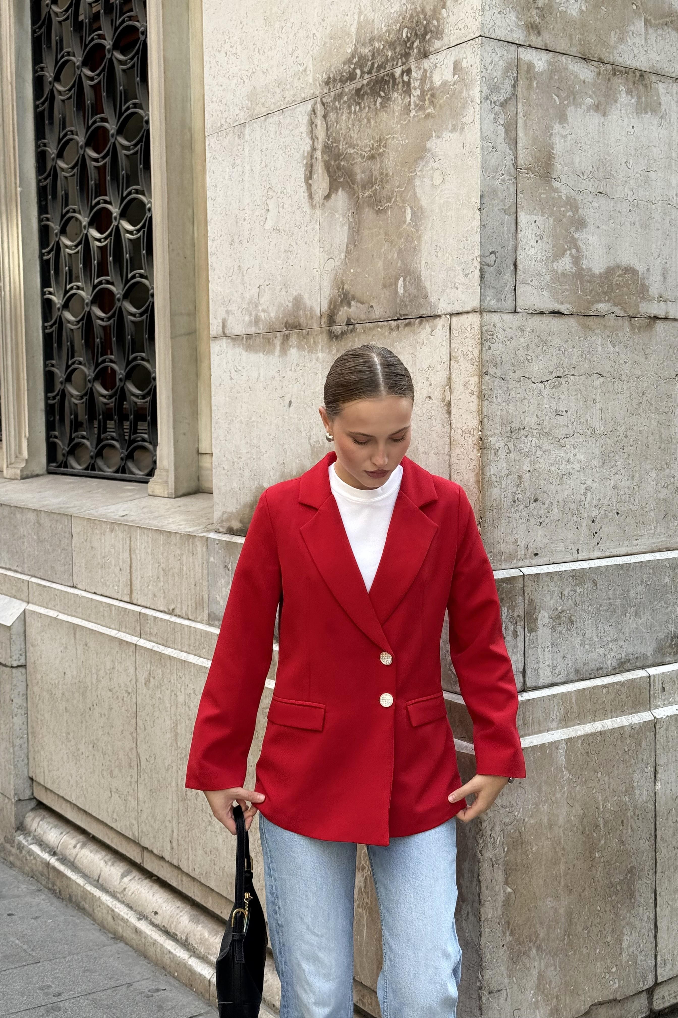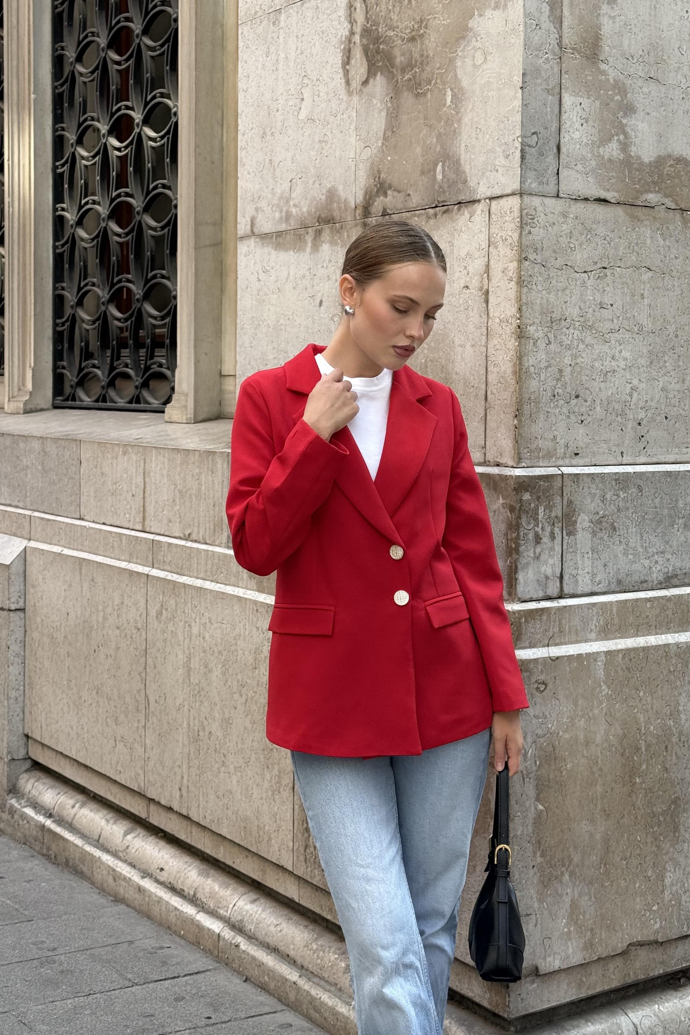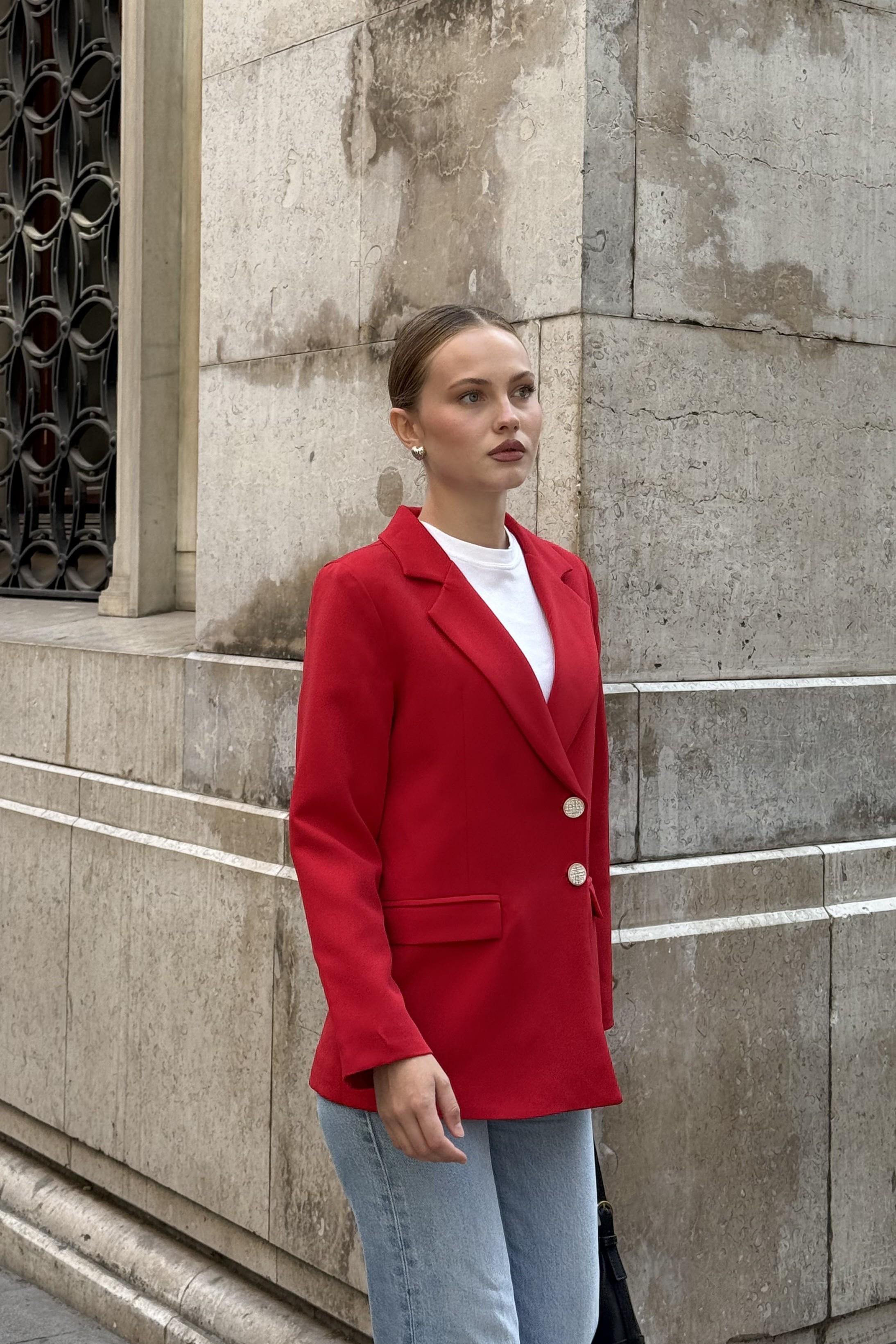 Düğmeleri Taşlı Kumaş Kırmızı Şık Ceket (500718CKTXKMZ)