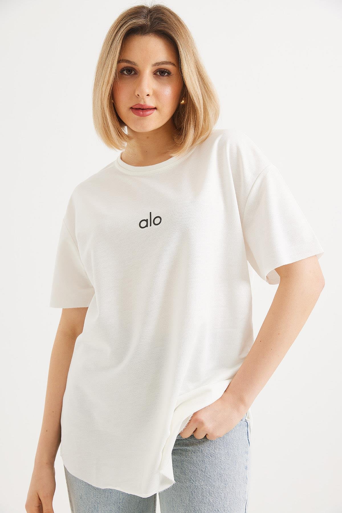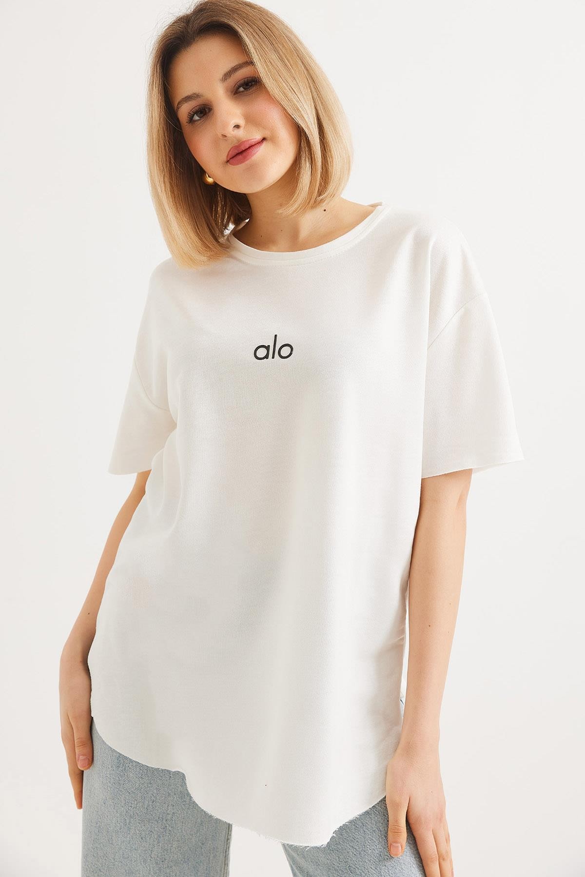 Eteği Oval Kesim Bisiklet Yaka Tshirt  Beyaz