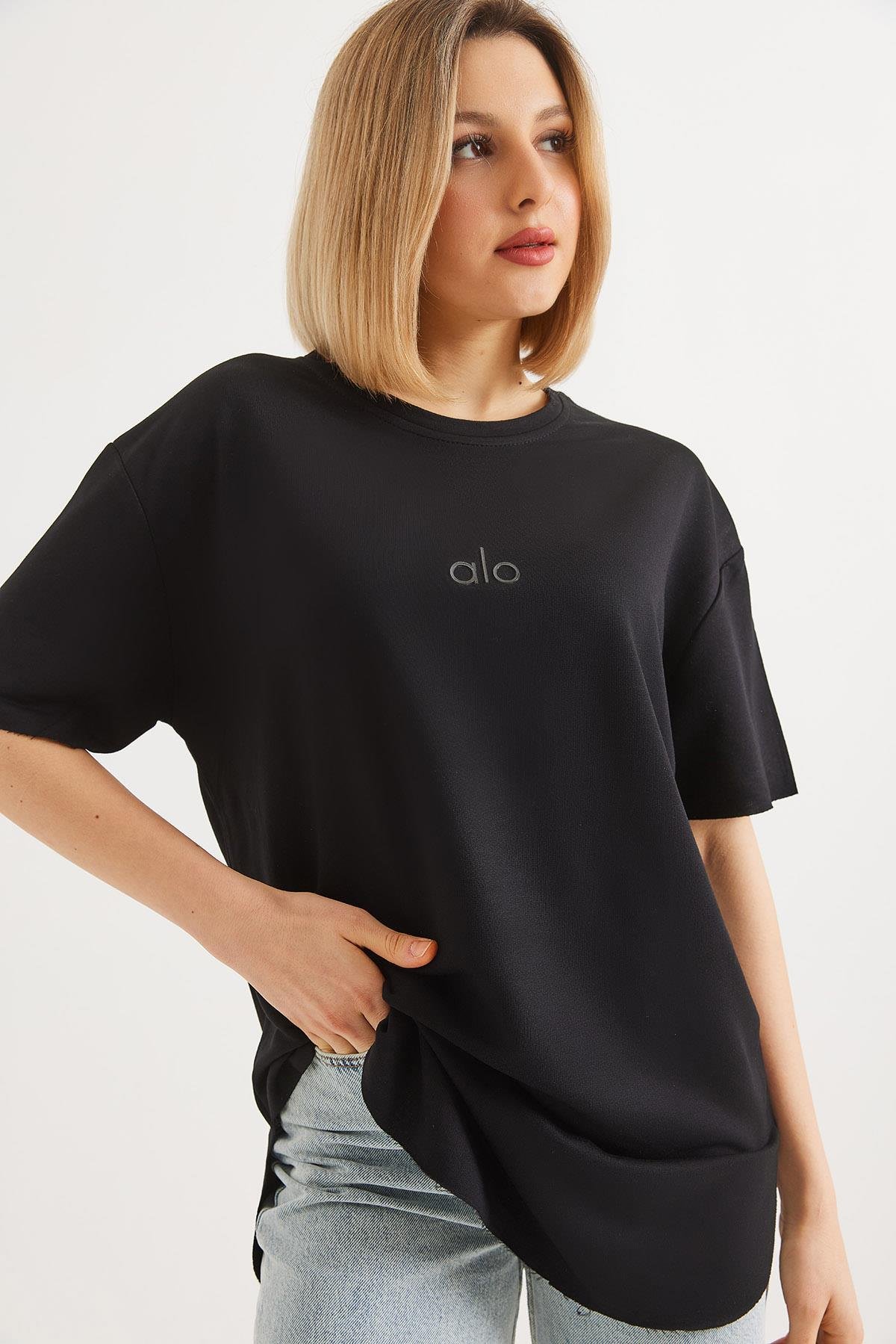 Eteği Oval Kesim Bisiklet Yaka Tshirt Siyah