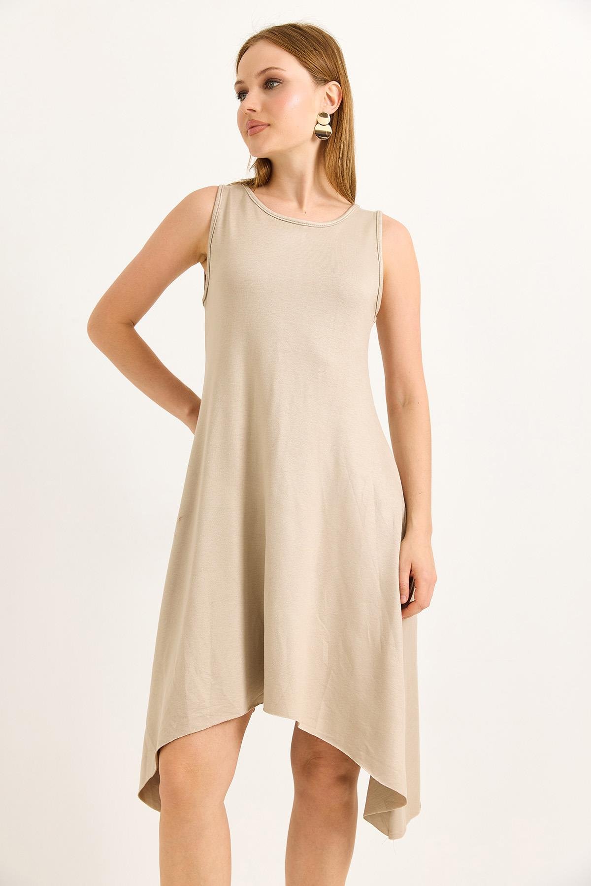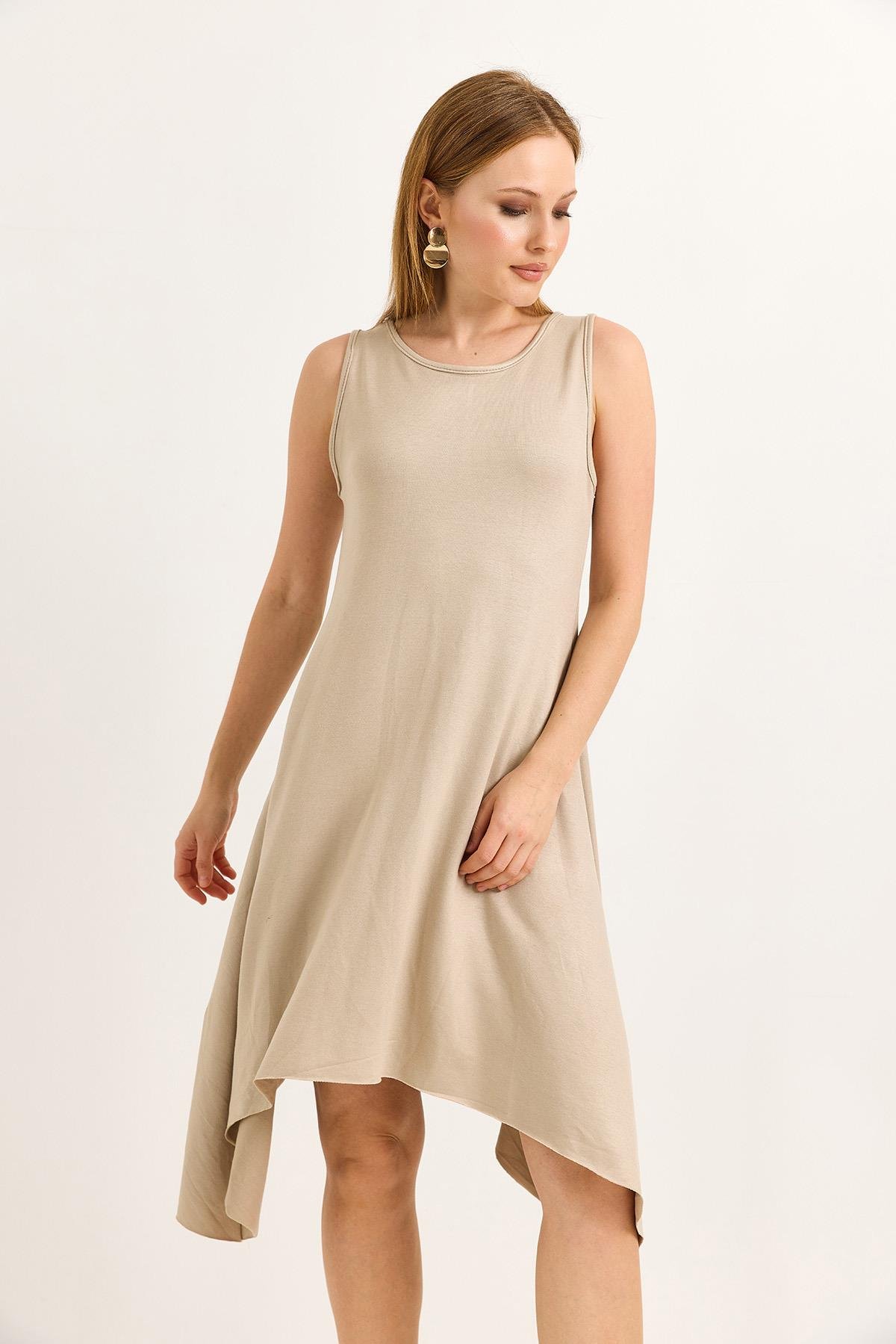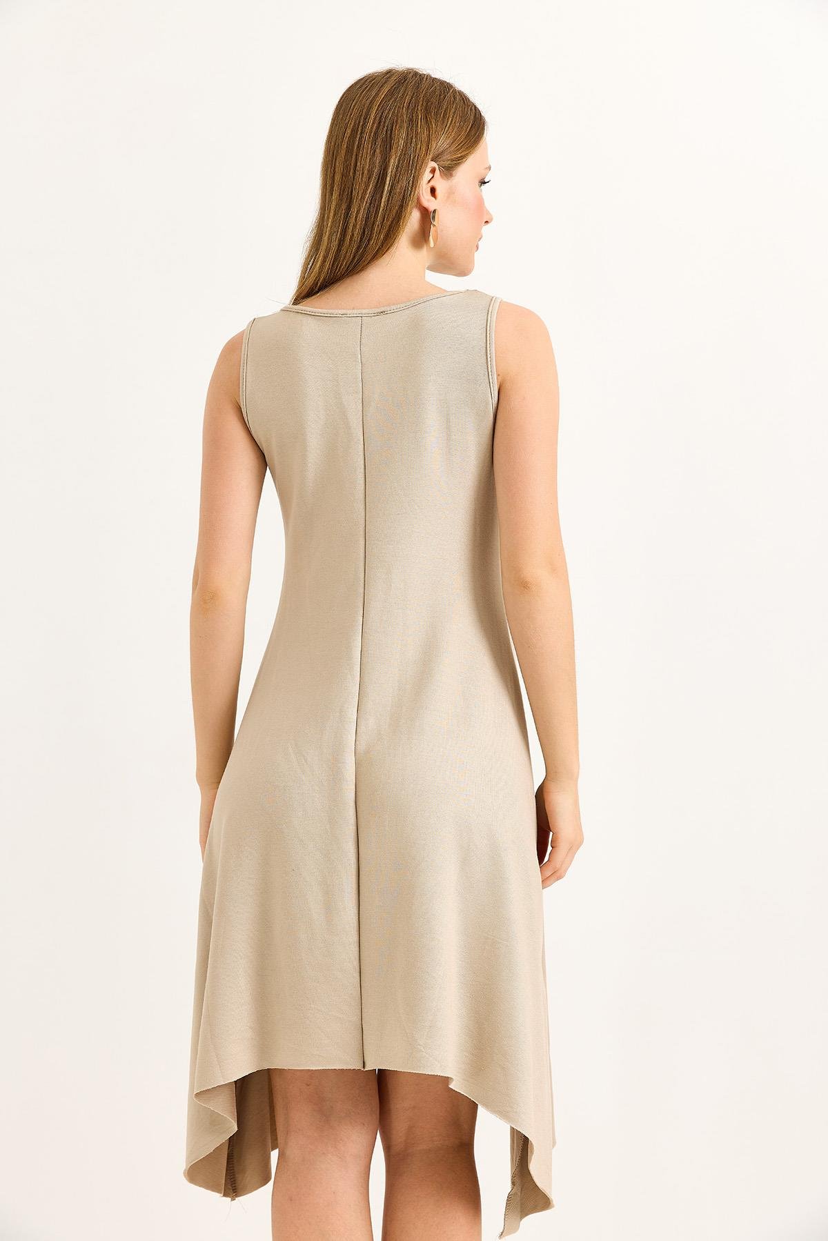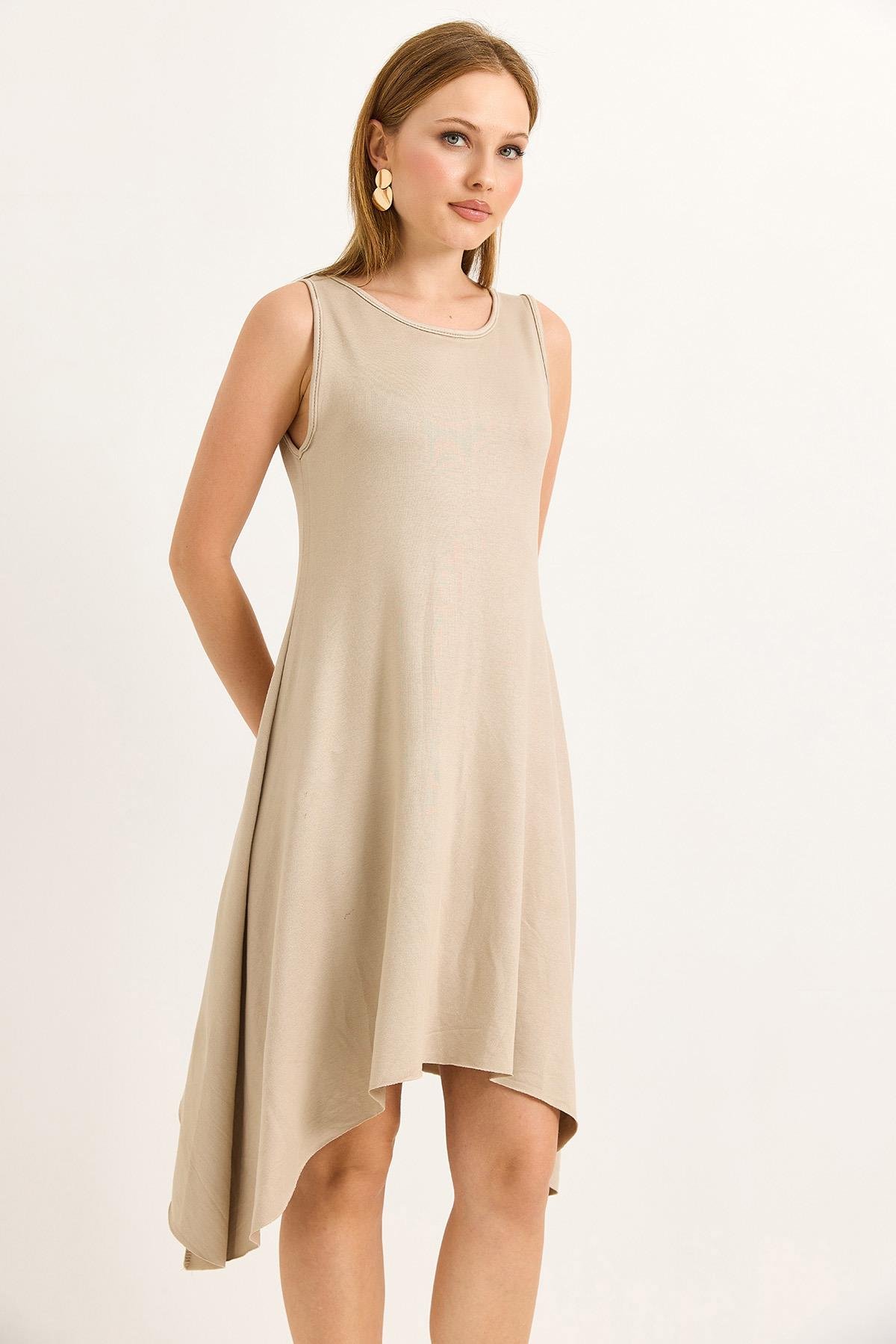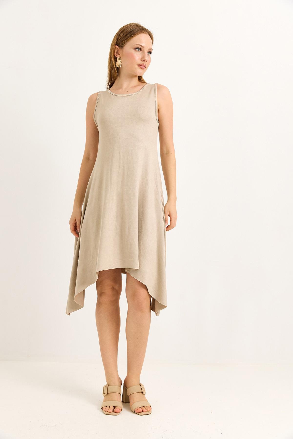 Eteği Parçalı Yumuşak Dokulu Midi Örme Vizon Elbise (500220ELBXVZN)