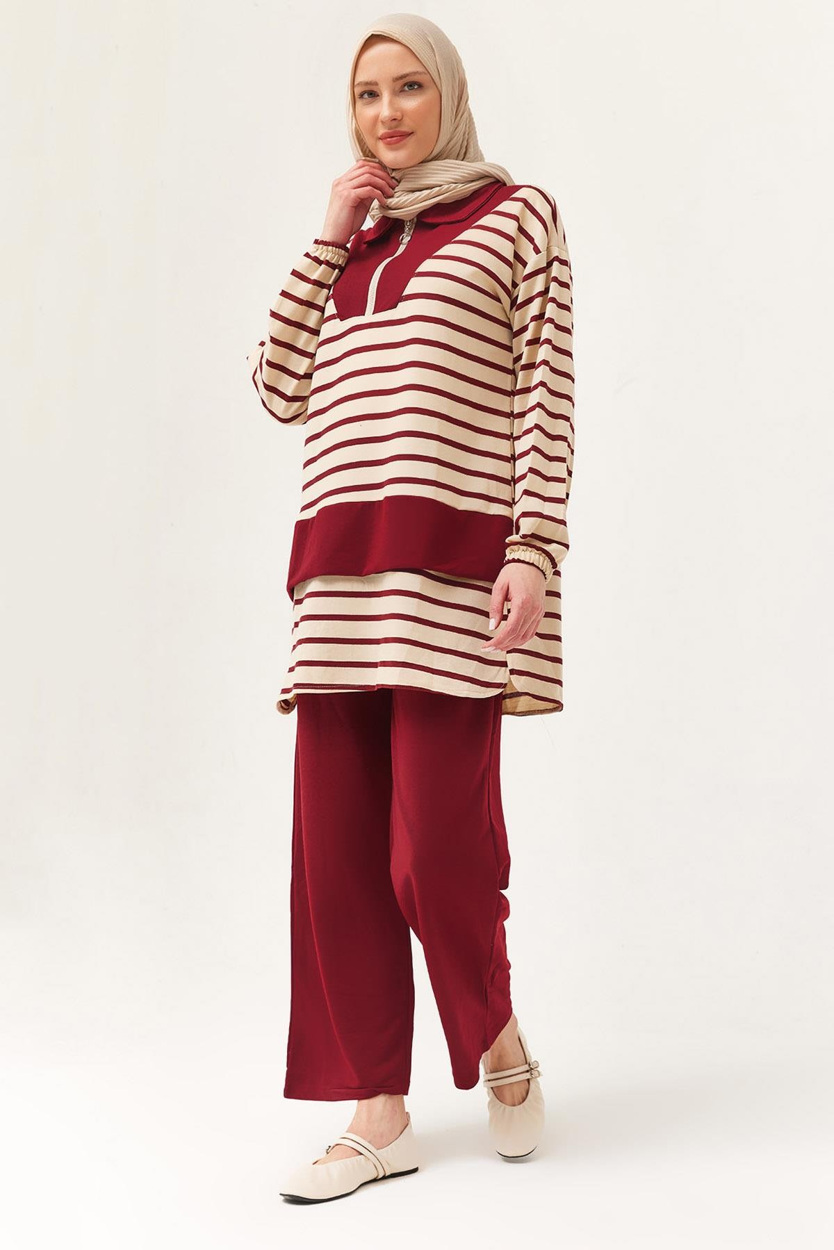 Fermuarlı Çizgili Gömlek Yaka Takım Bordo (250435TKMXBRD)