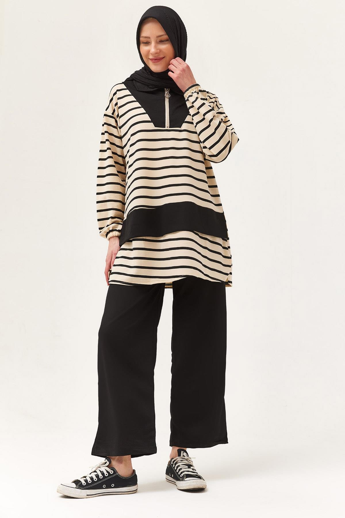 Fermuarlı Çizgili Gömlek Yaka Takım Siyah (250435TKMXSYH)