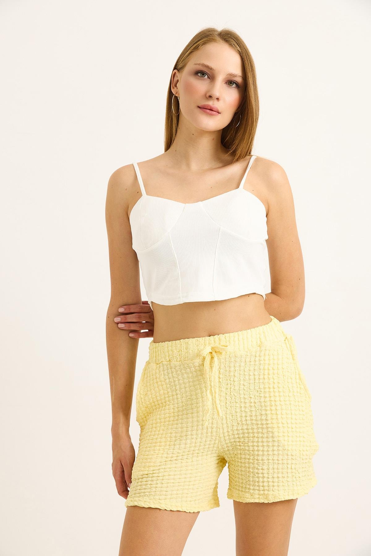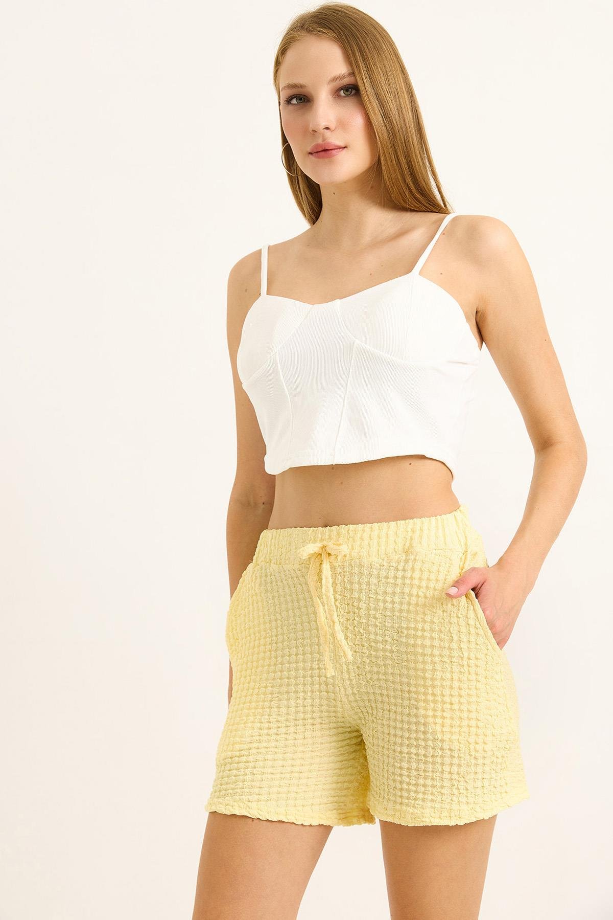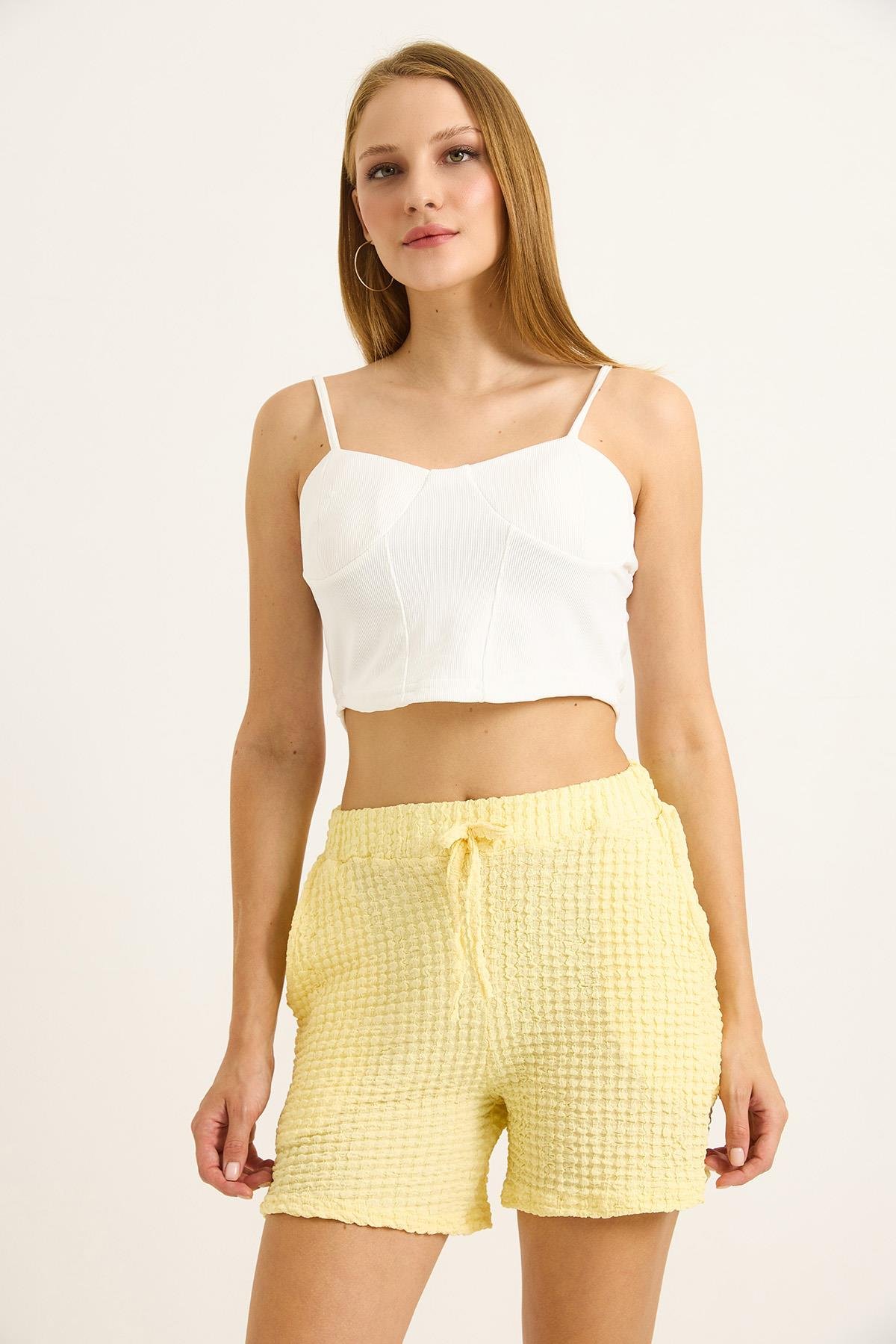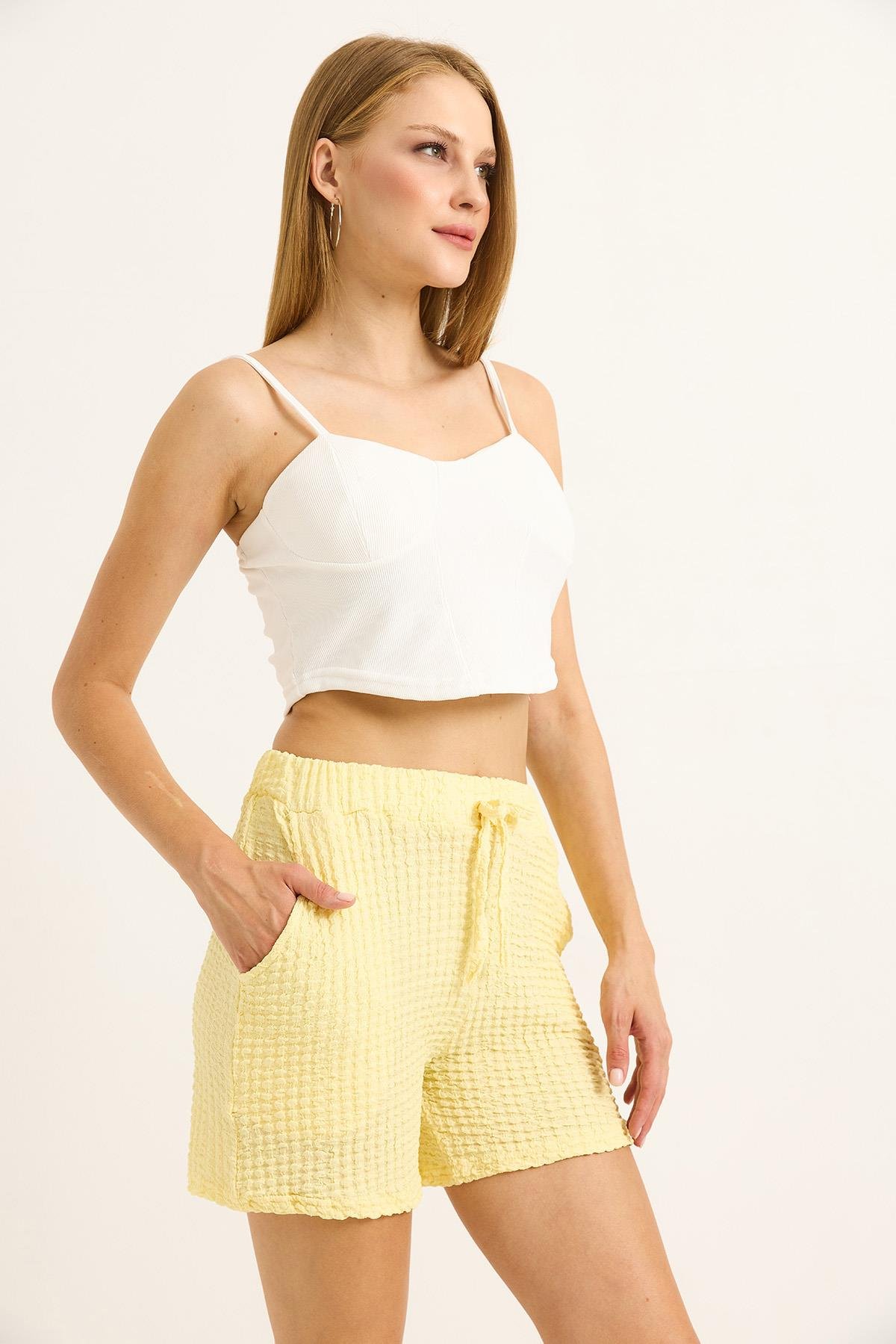 Gofre Kumaş Bel Lastikli Kadın Şort Sarı