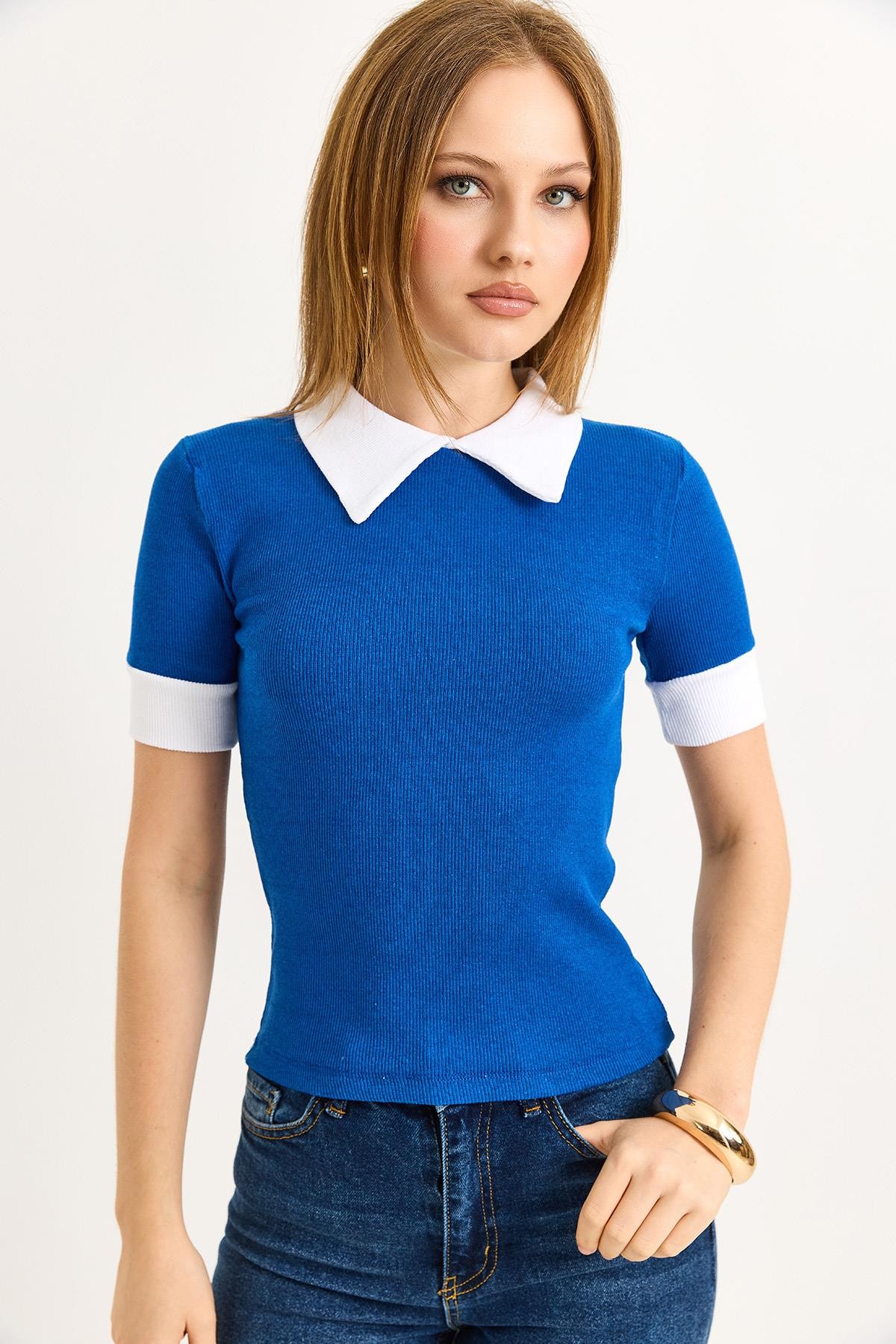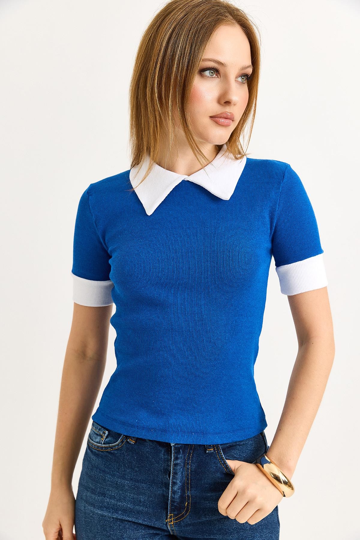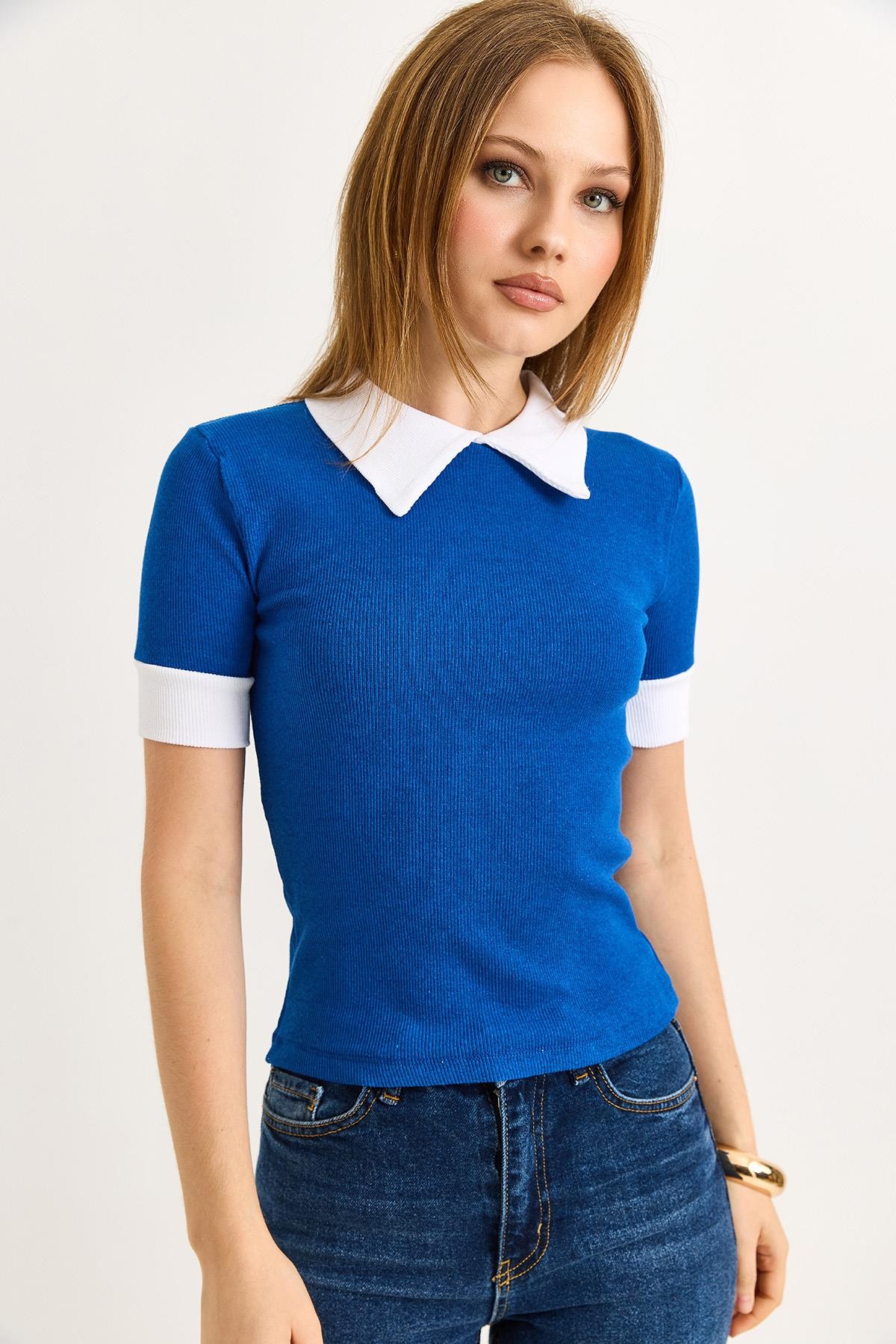 Gömlek Yaka Kaşkorse Bluz Saks (500182BLZXMVİ)