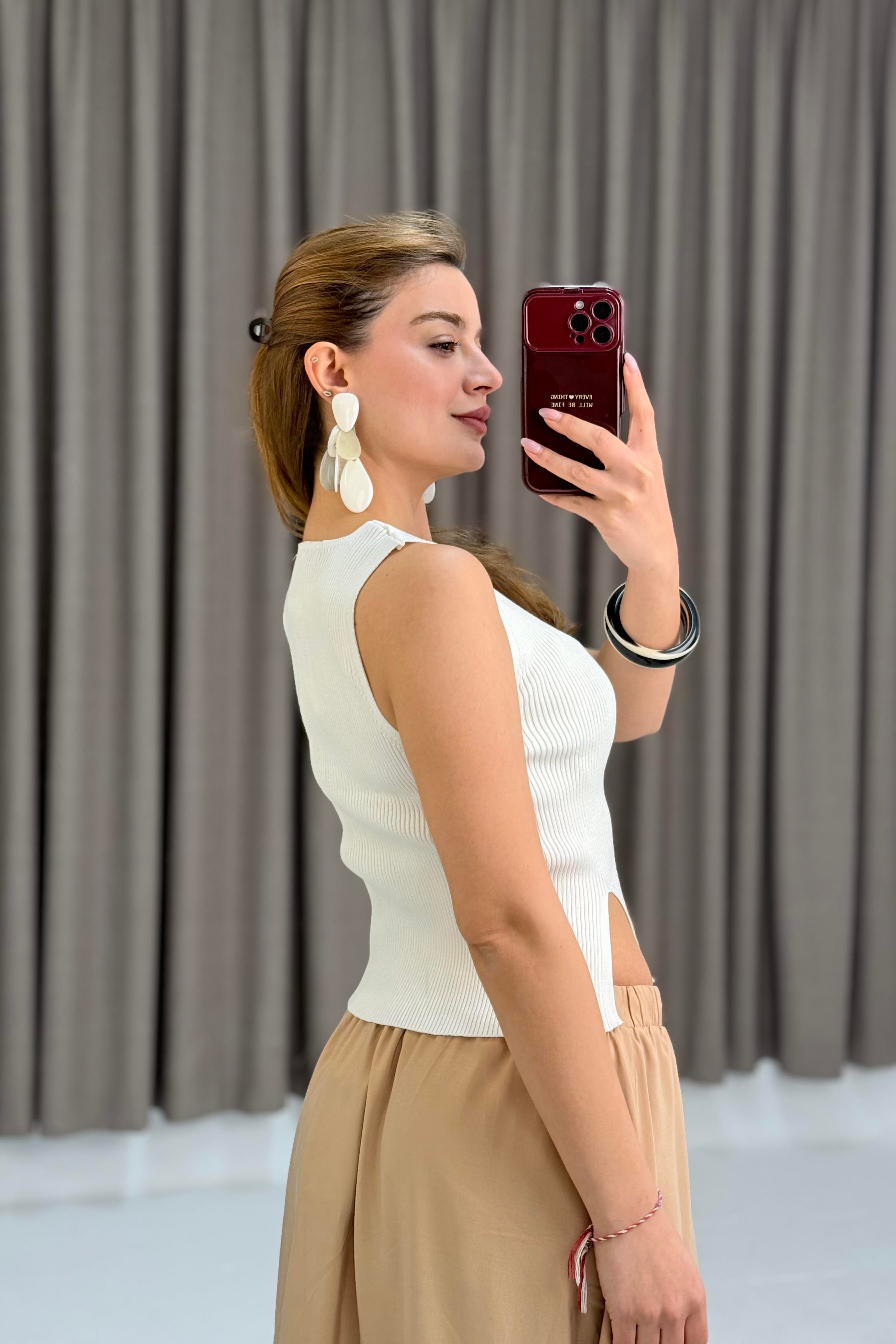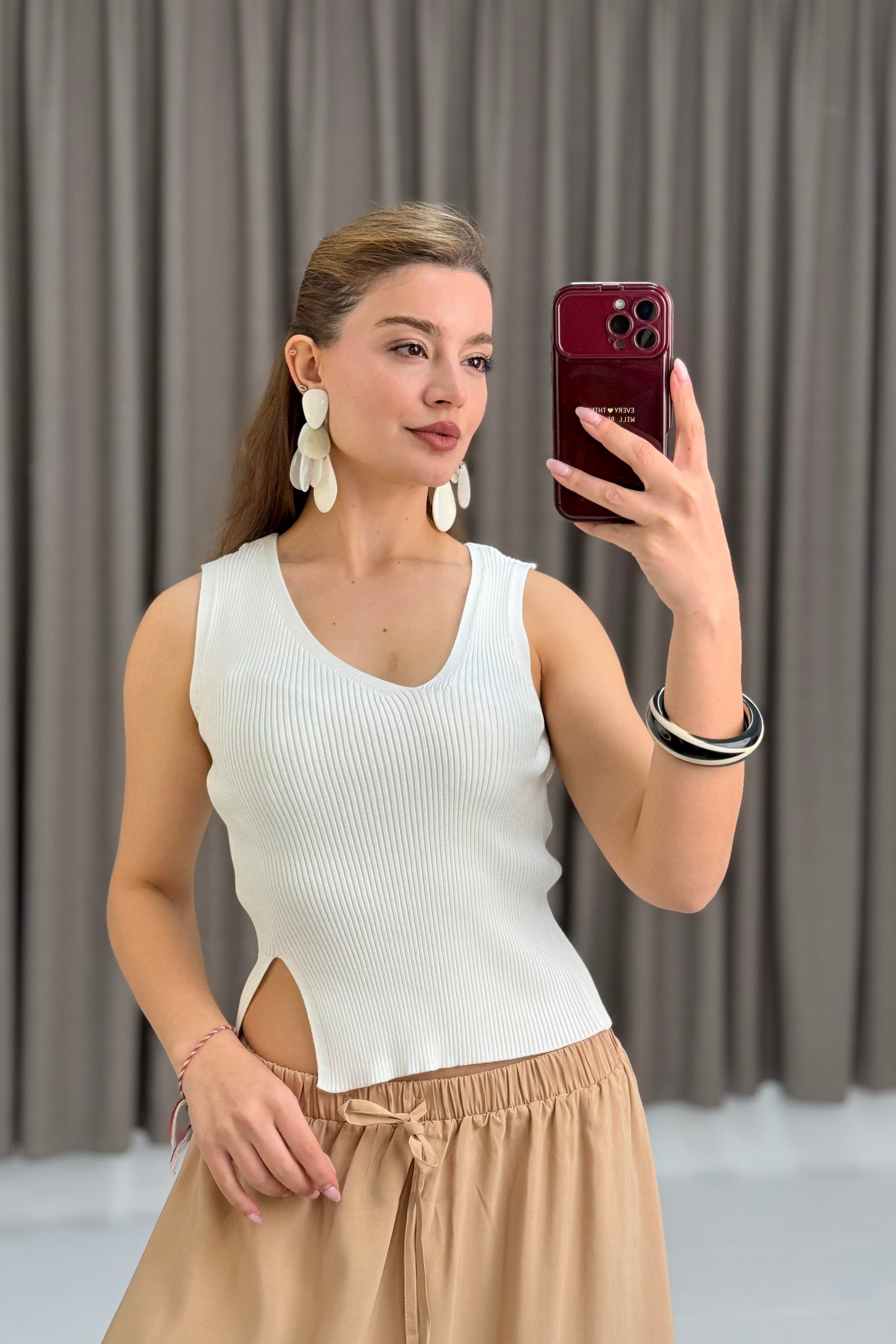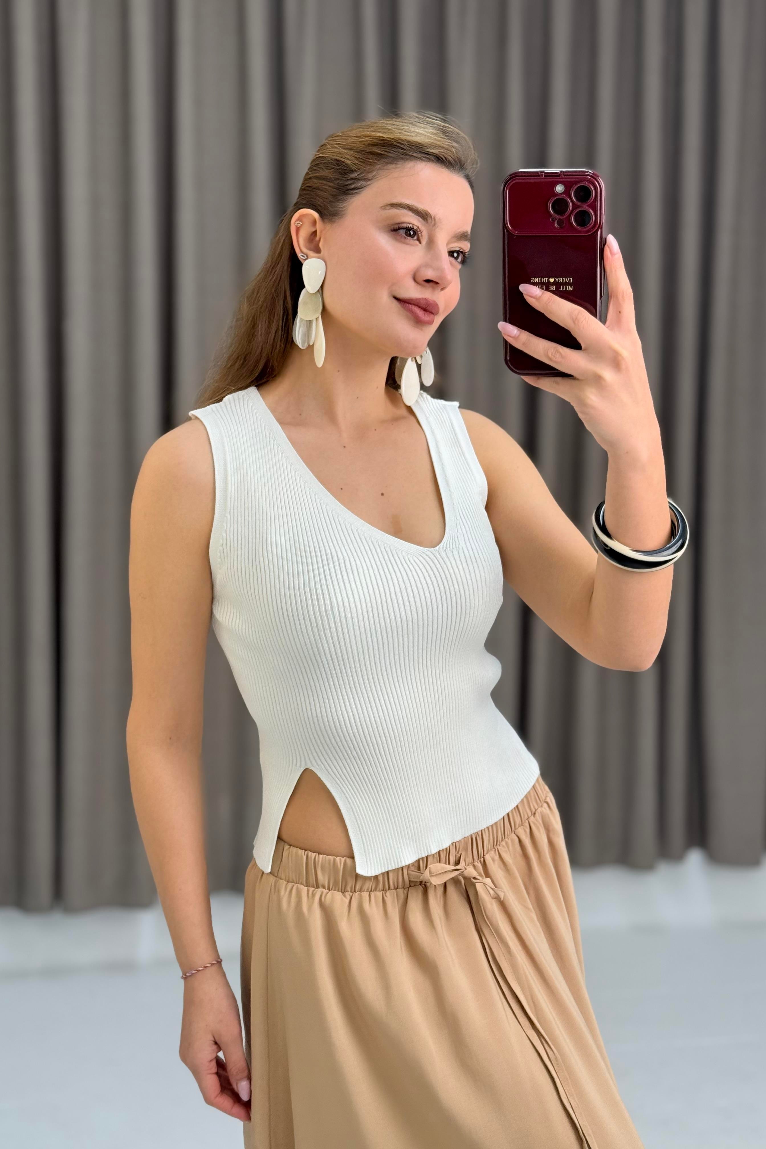 Hafif Yırtmaçlı Tasarım Yaka Triko Bluz Bej (251049BLZXBEJ)
