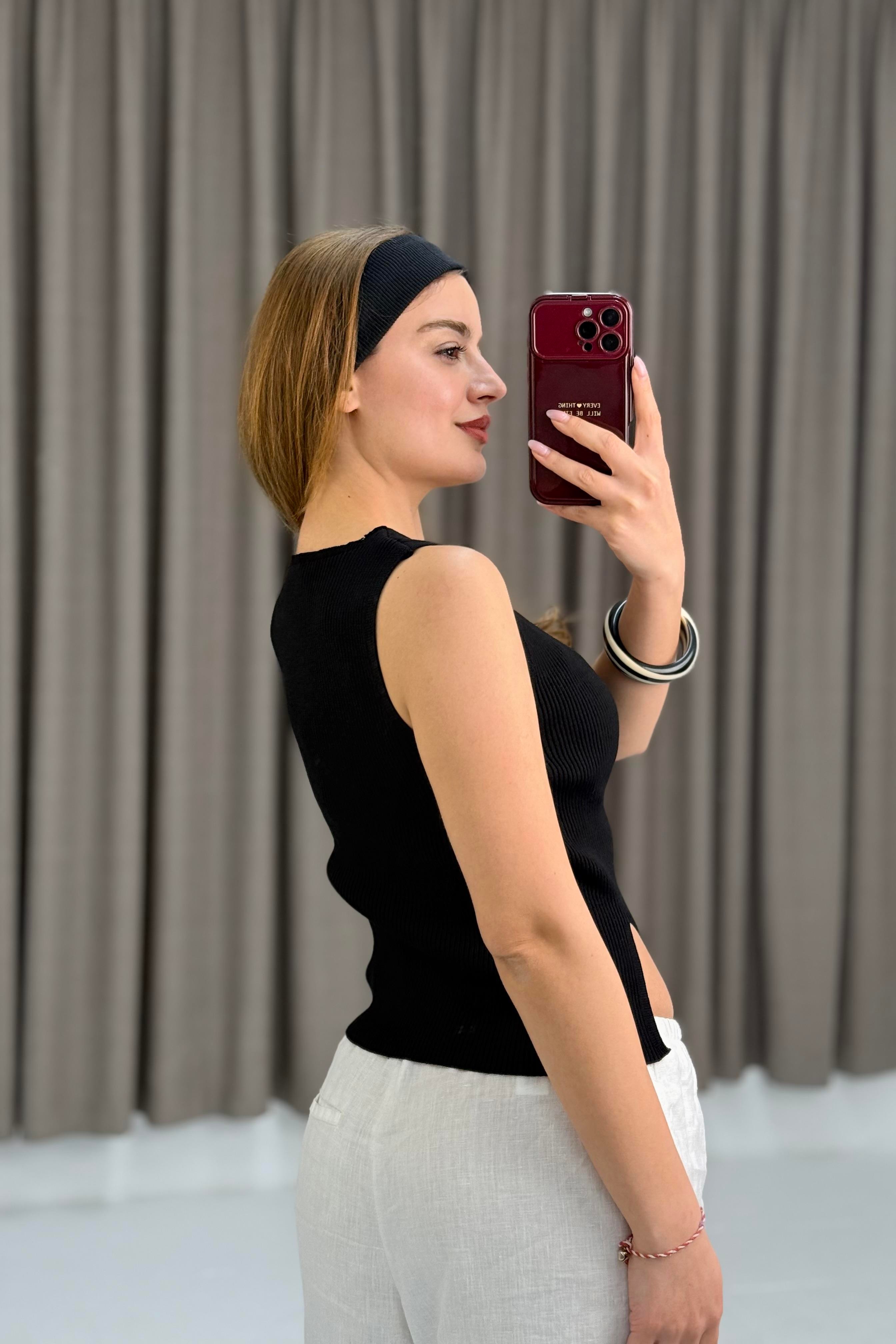Hafif Yırtmaçlı Tasarım Yaka Triko Bluz Siyah