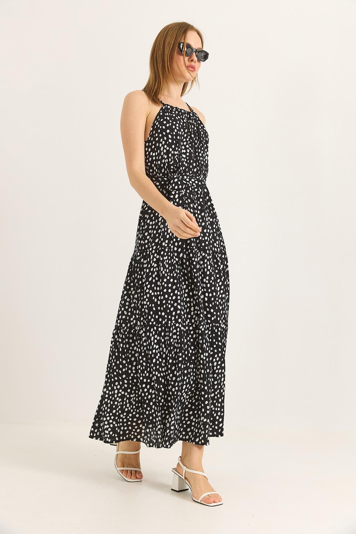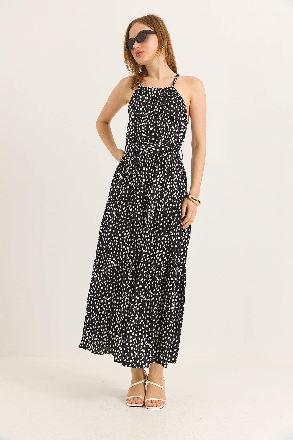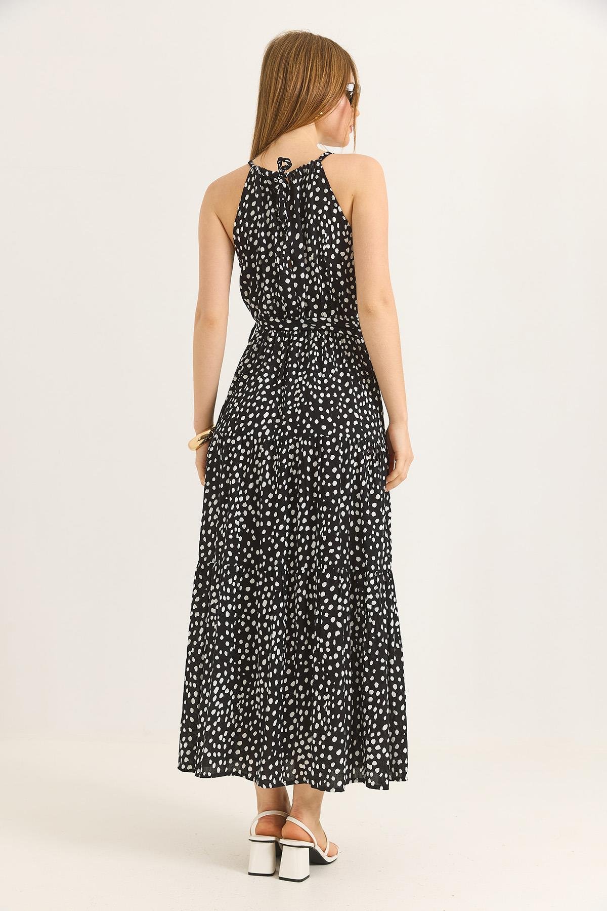 Halter Yaka Beli Kuşaklı Puantiyeli Siyah Elbise (250670ELBZSBYZ)