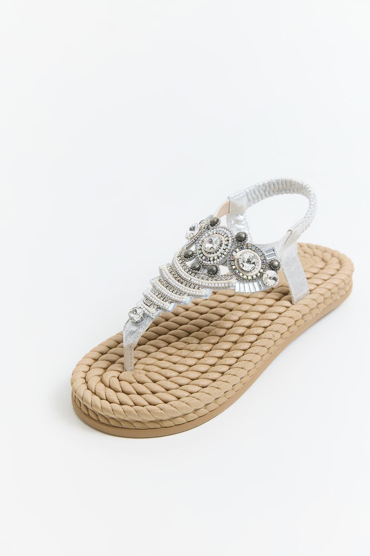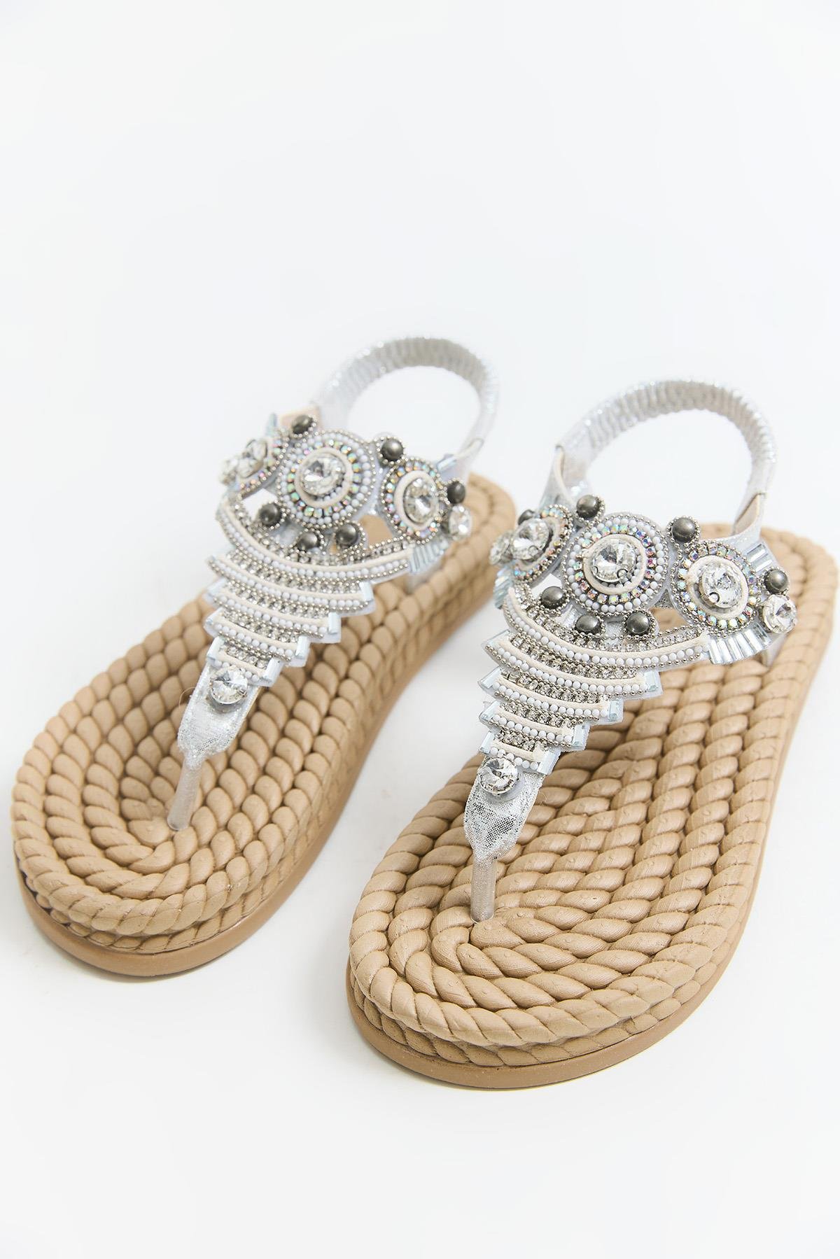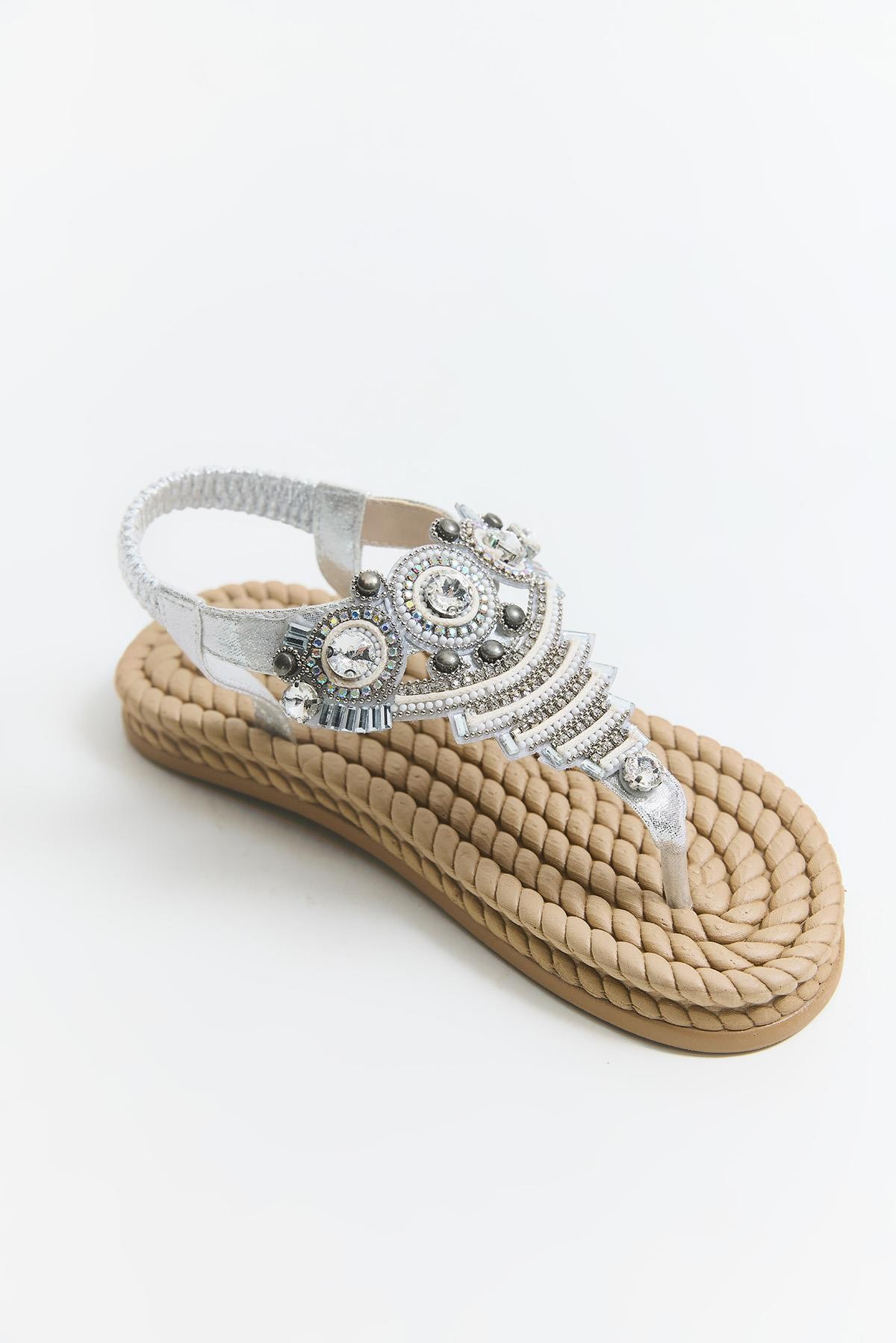 Hasır Taban İnci Taşlı Parmak Arası Terlik Gümüş
