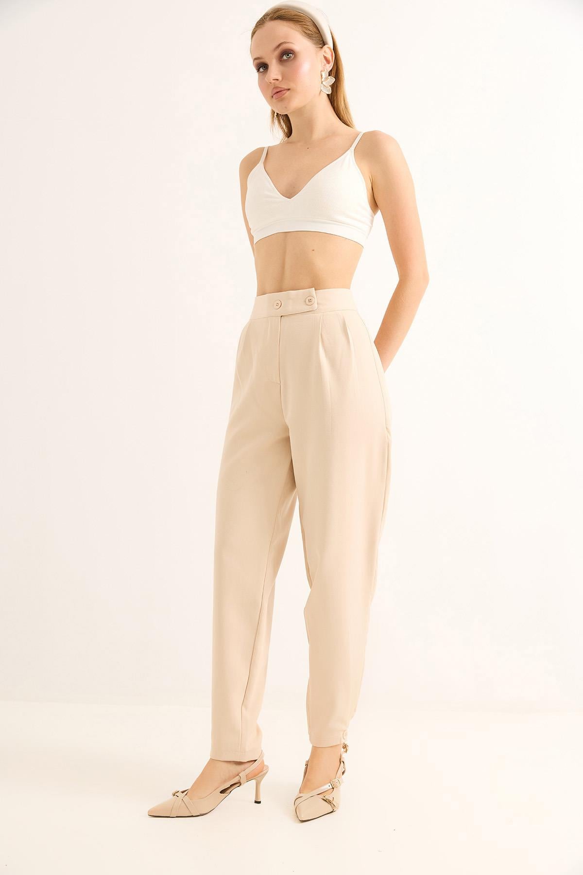 Havuç Model Çift Düğmeli Palazzo Pantolon Krem