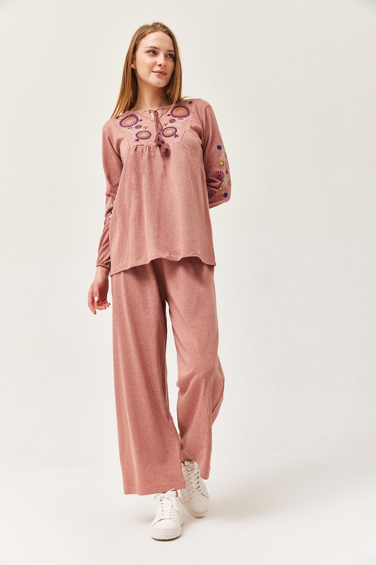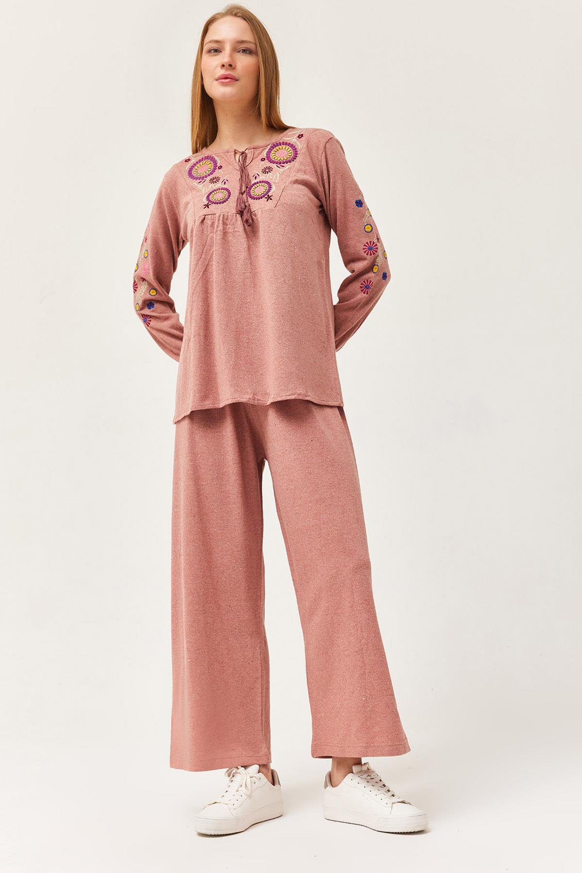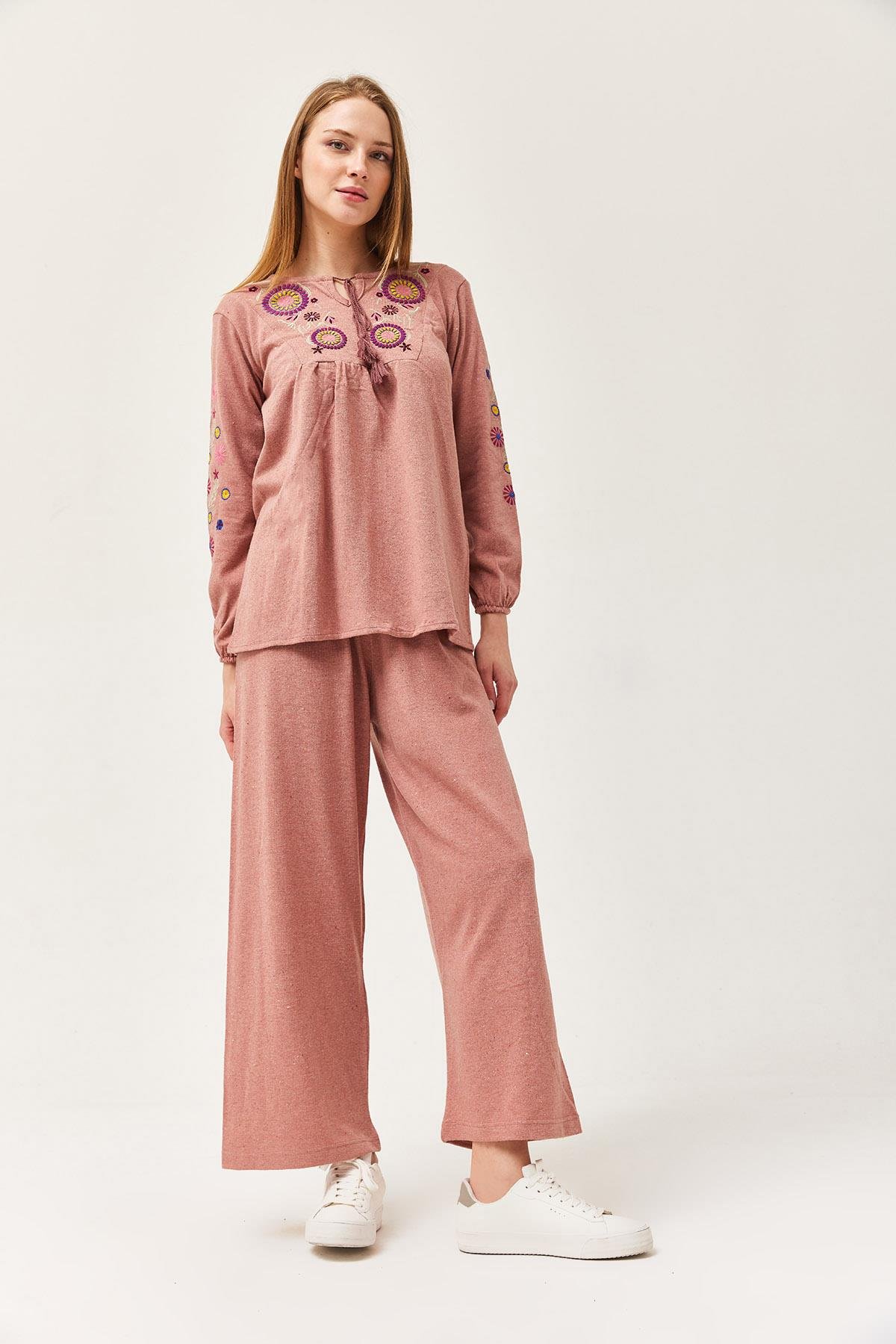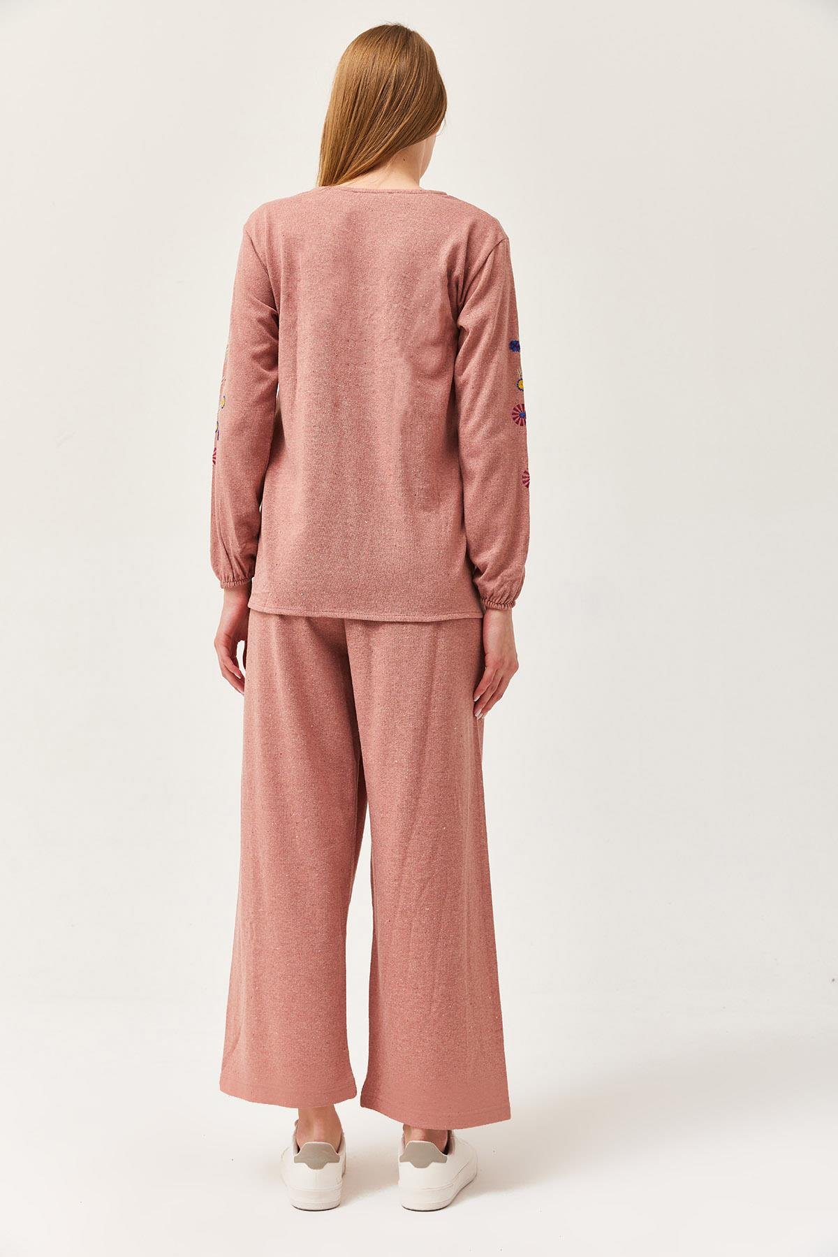 Hera Kumaş Önü ve Kolları İşlemeli İkili Takım Gül Kurusu