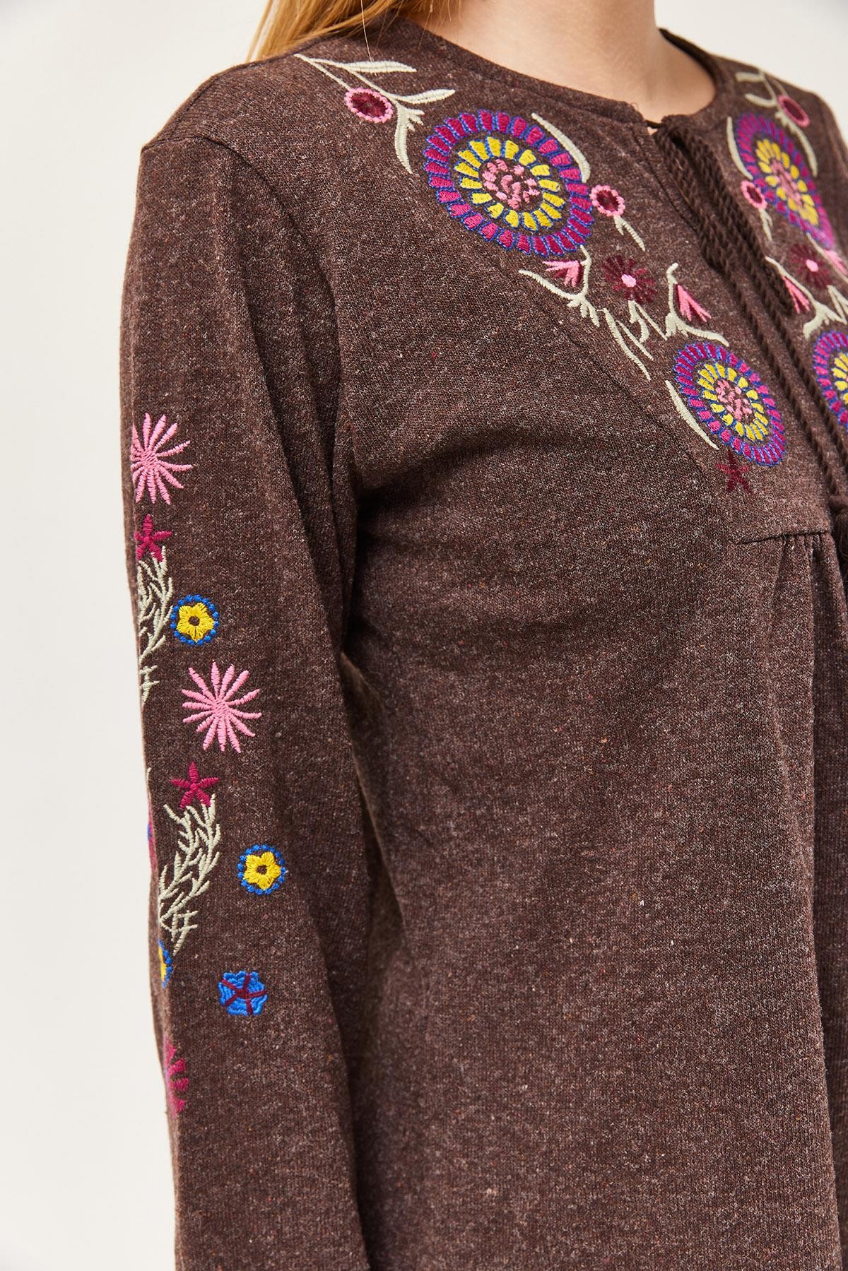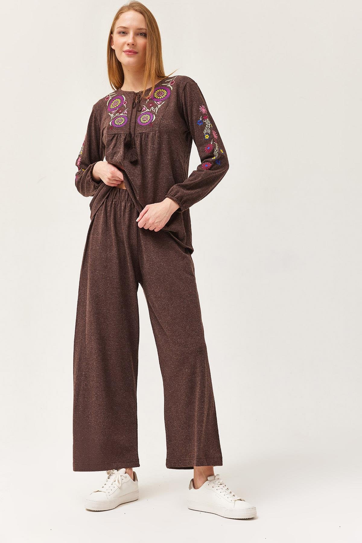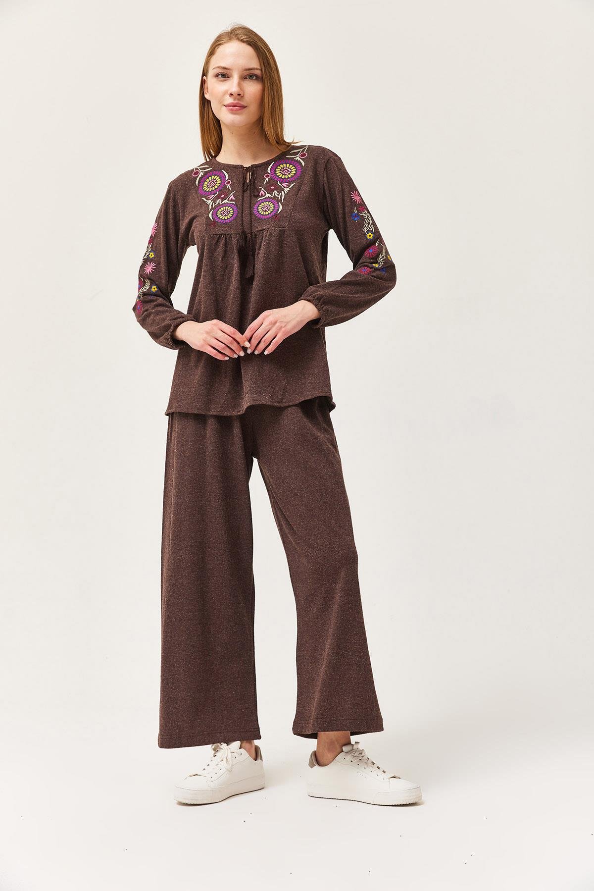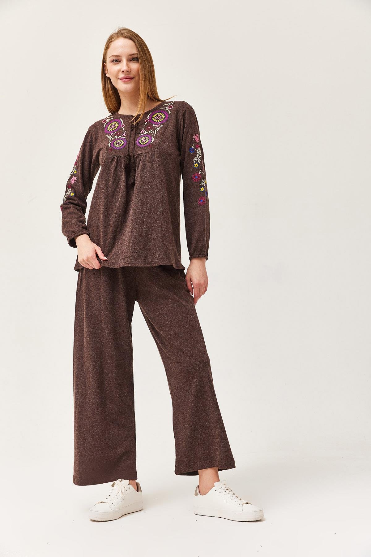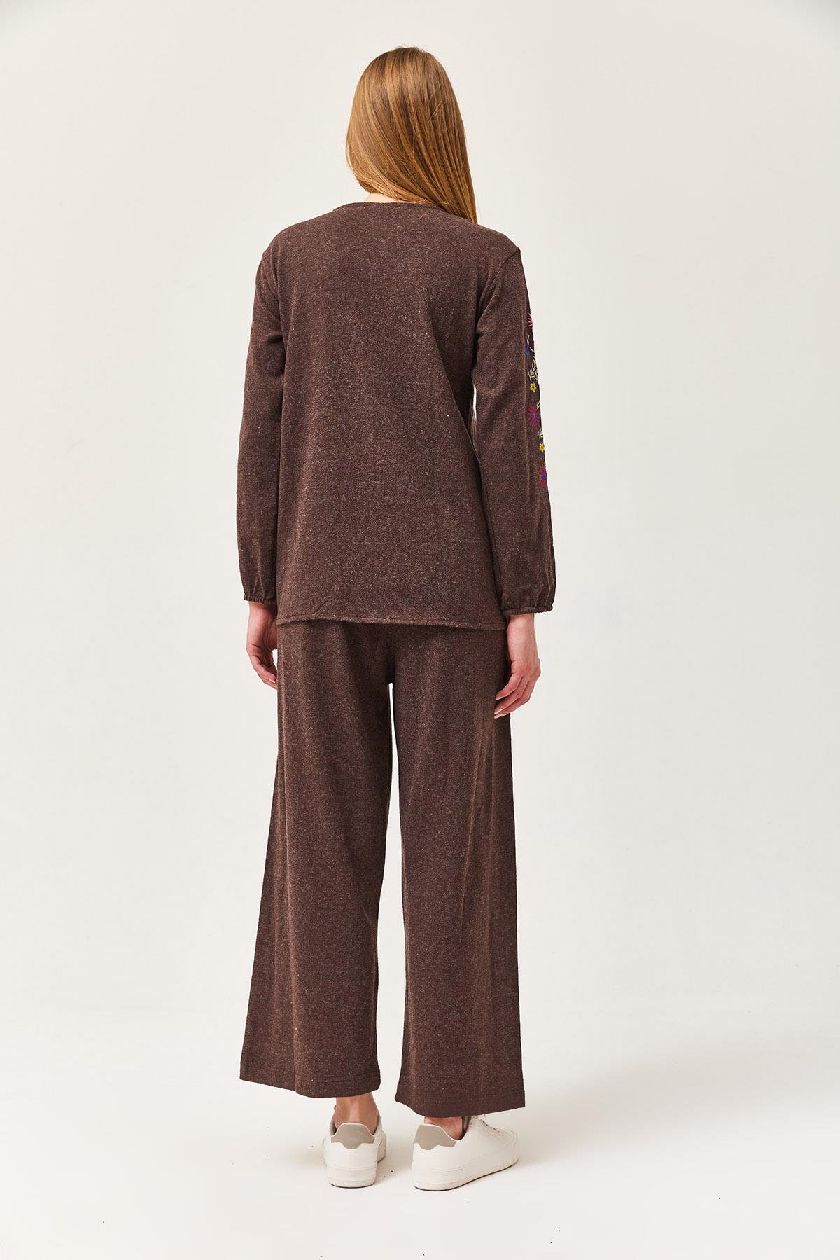 Hera Kumaş Önü ve Kolları İşlemeli İkili Takım Kahverengi