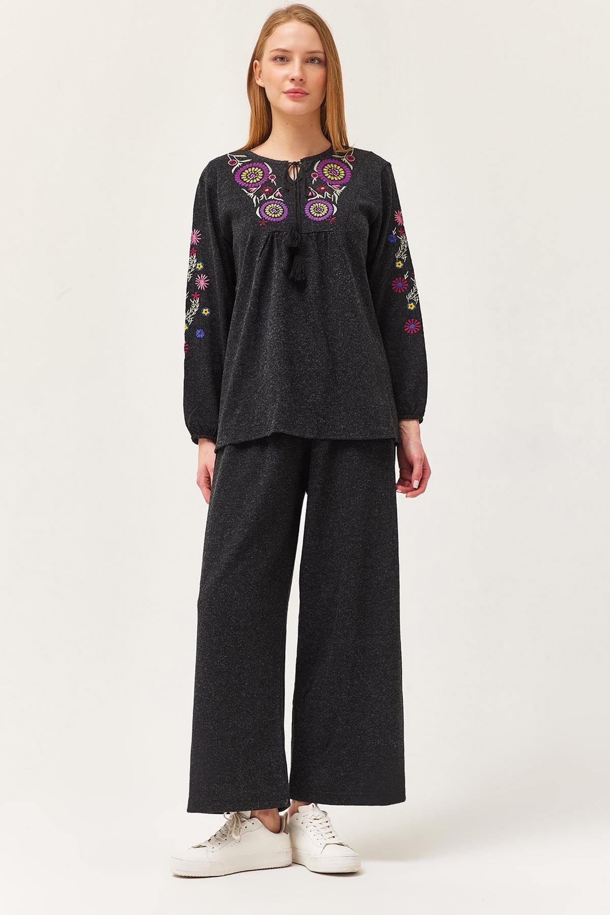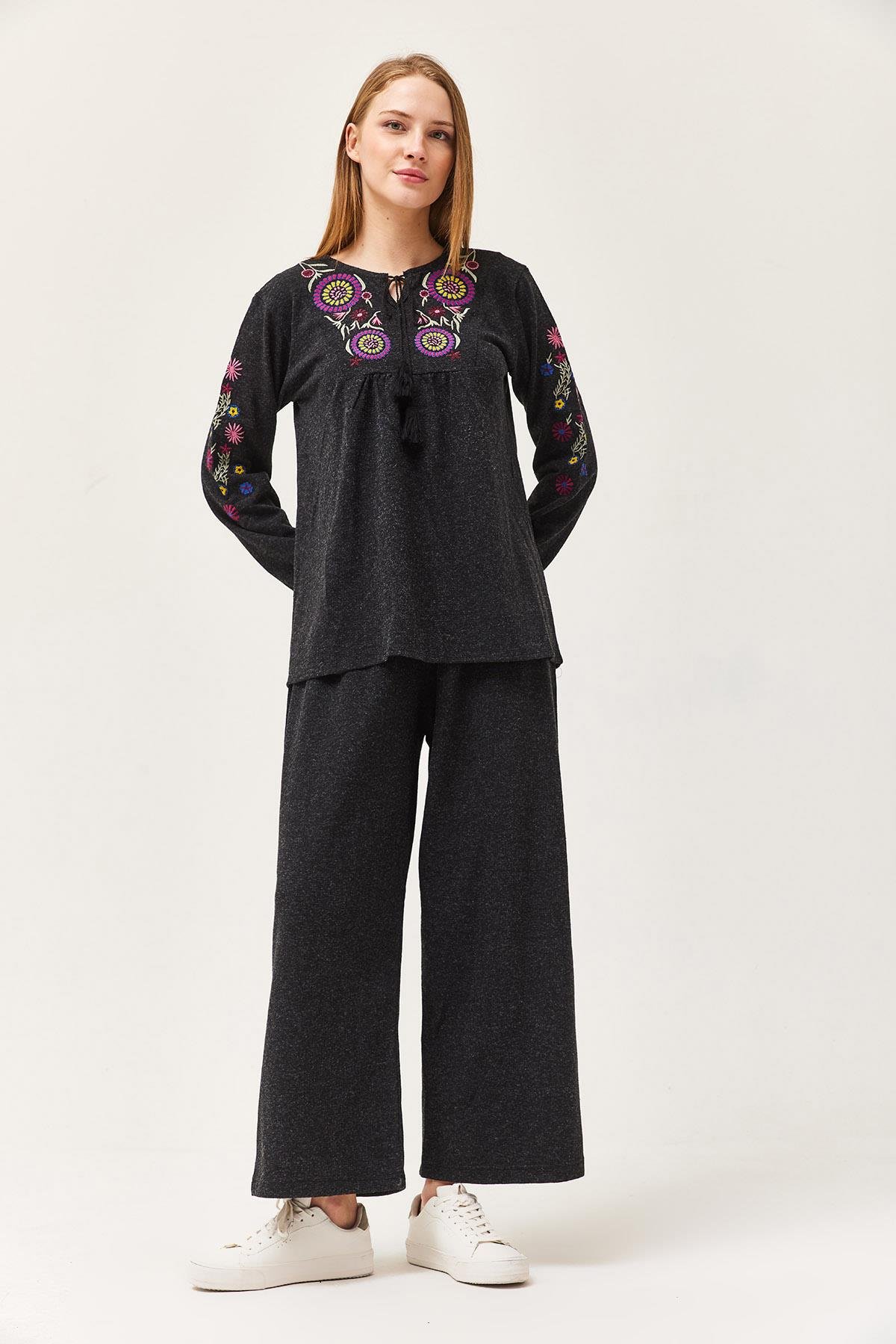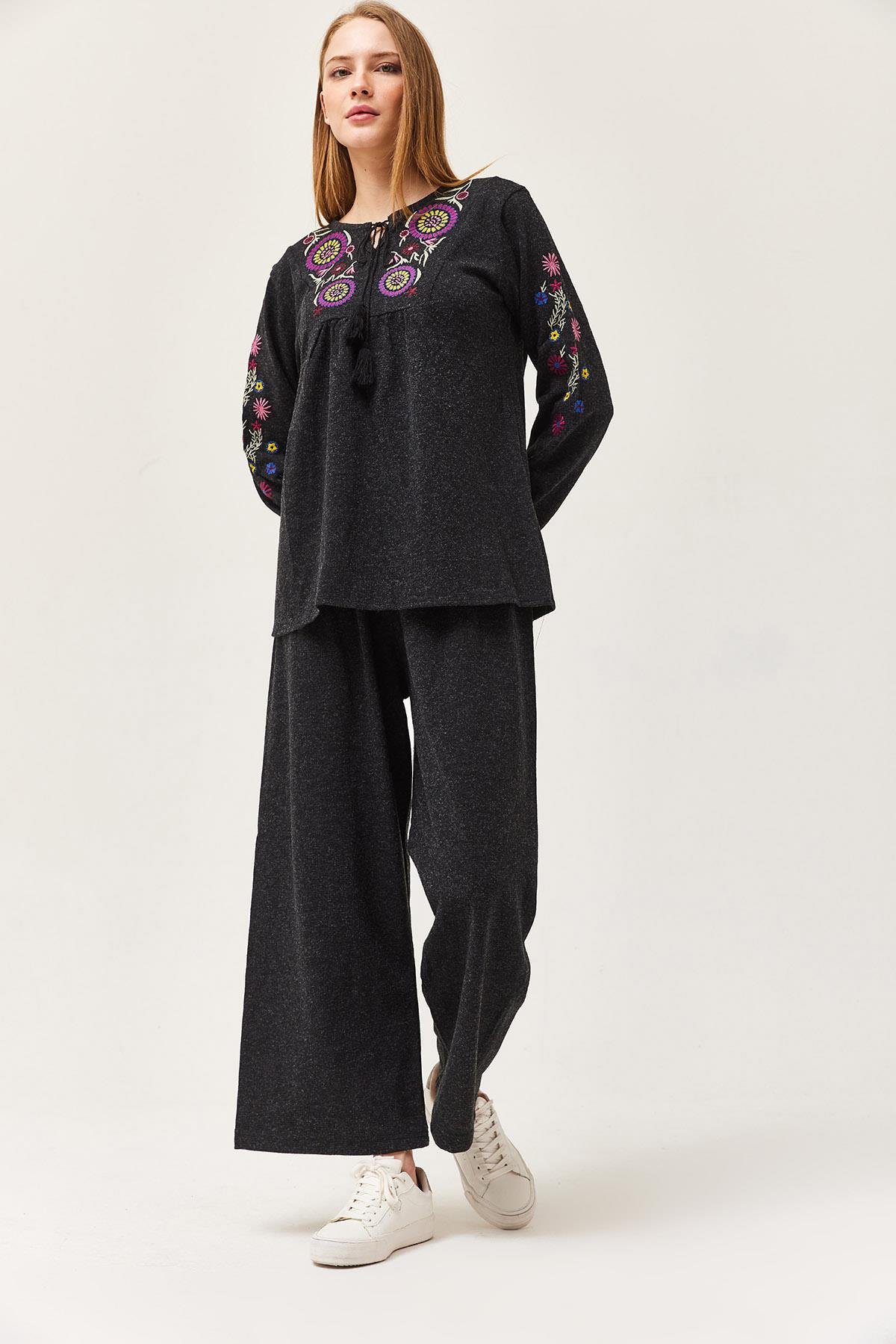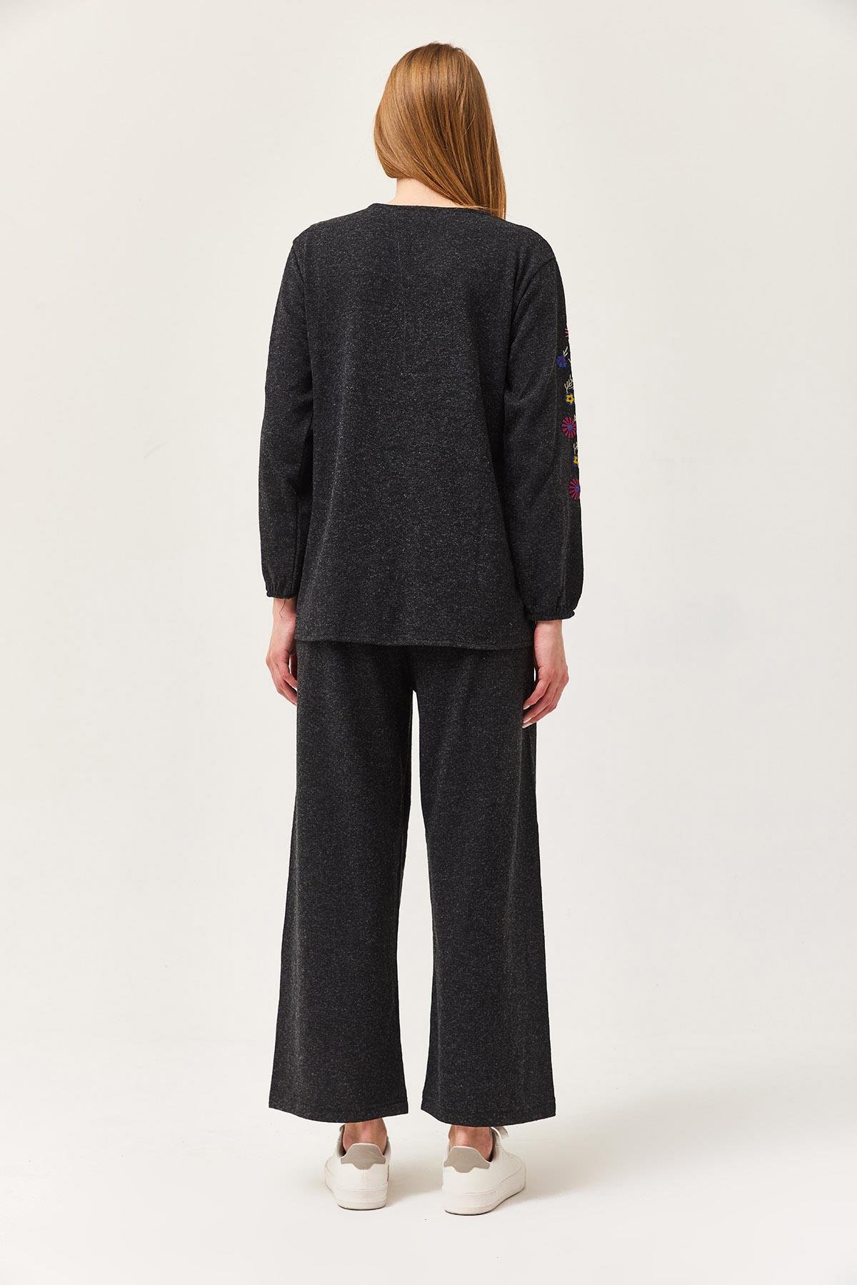 Hera Kumaş Önü ve Kolları İşlemeli İkili Takım Siyah