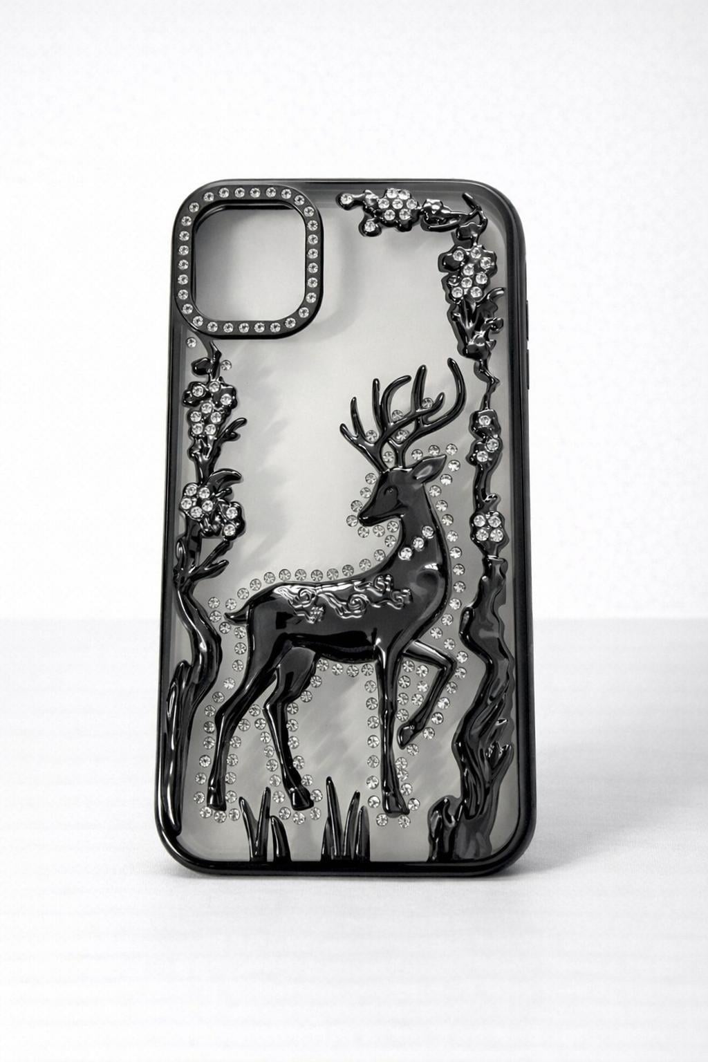 İphone 13 Uyumlu Geyik ve Çiçek Kabartmalı Kılıf Siyah