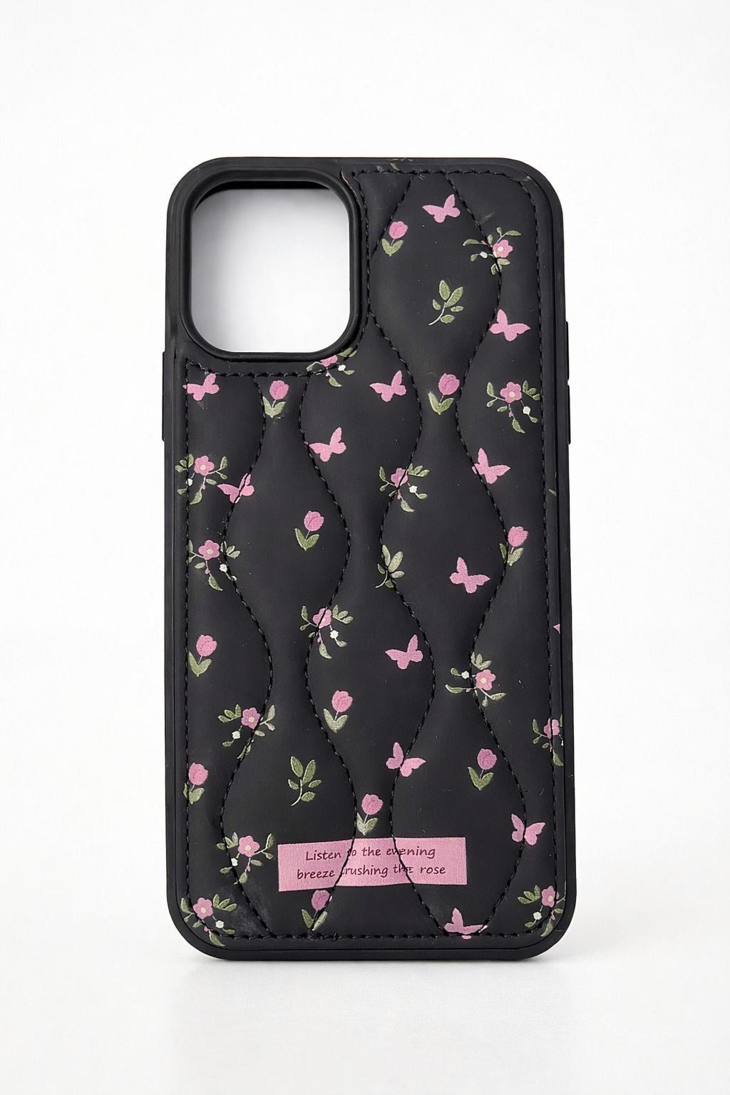 İphone 14 Pro Max Uyumlu Çiçek Desenli Kabartmalı Kılıf Siyah