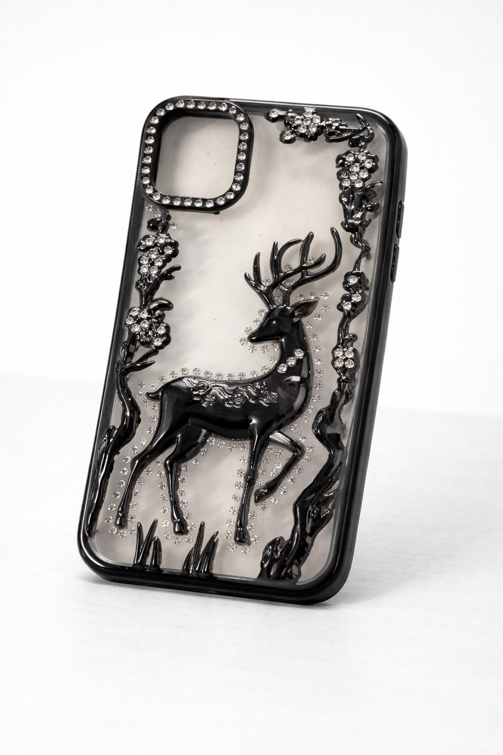 İphone 14 Pro Max Uyumlu Geyik ve Çiçek Kabartmalı Kılıf Siyah