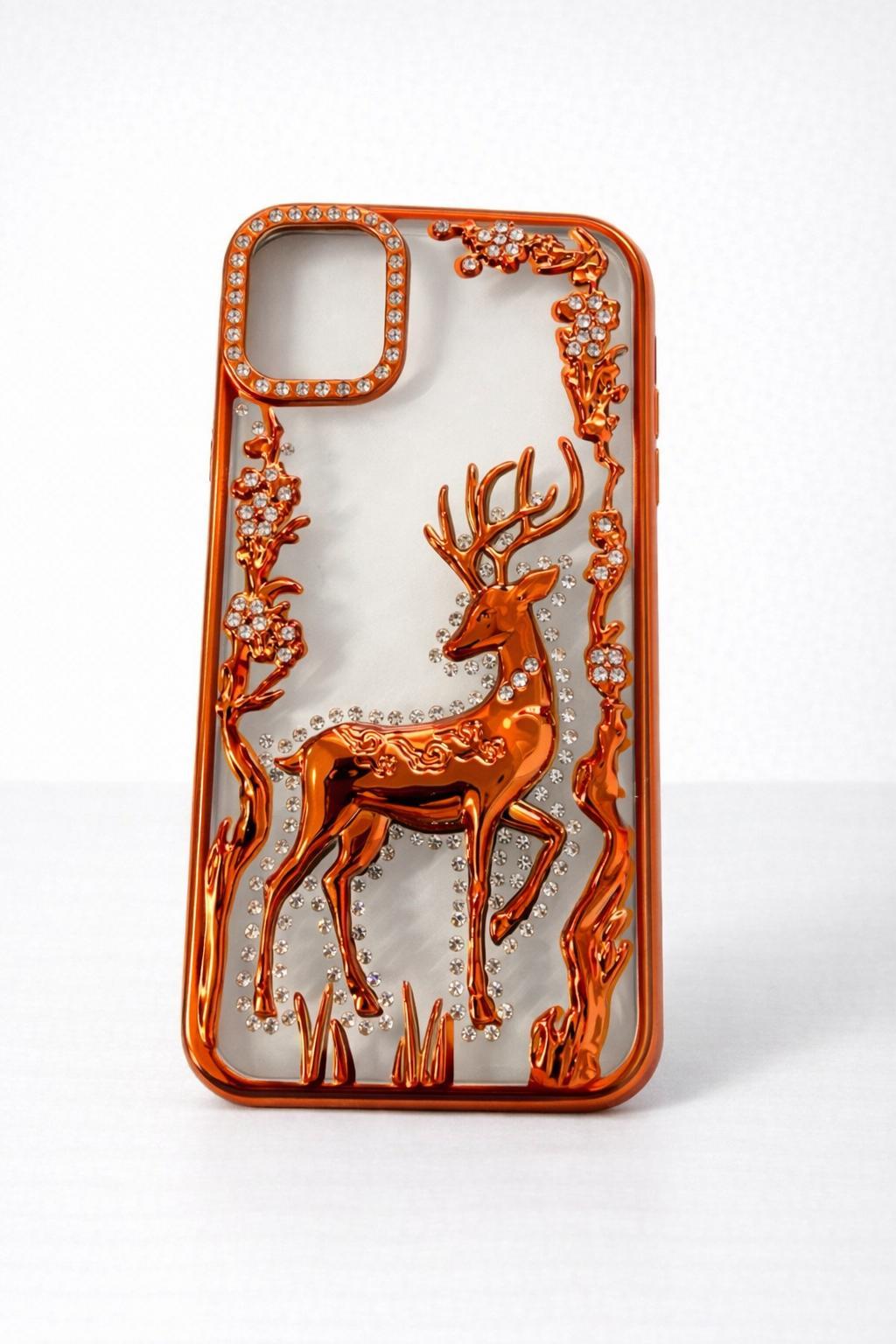 İphone 15 Pro Uyumlu Geyik ve Çiçek Kabartmalı Kılıf Turuncu