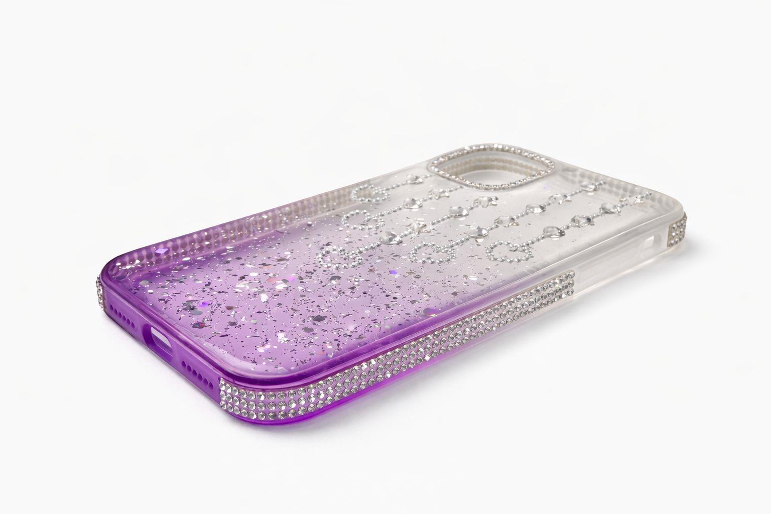 İphone 15 Uyumlu Şeffaf ve Mor Geçişli Kalp-Yıldız Taşlı Kılıf