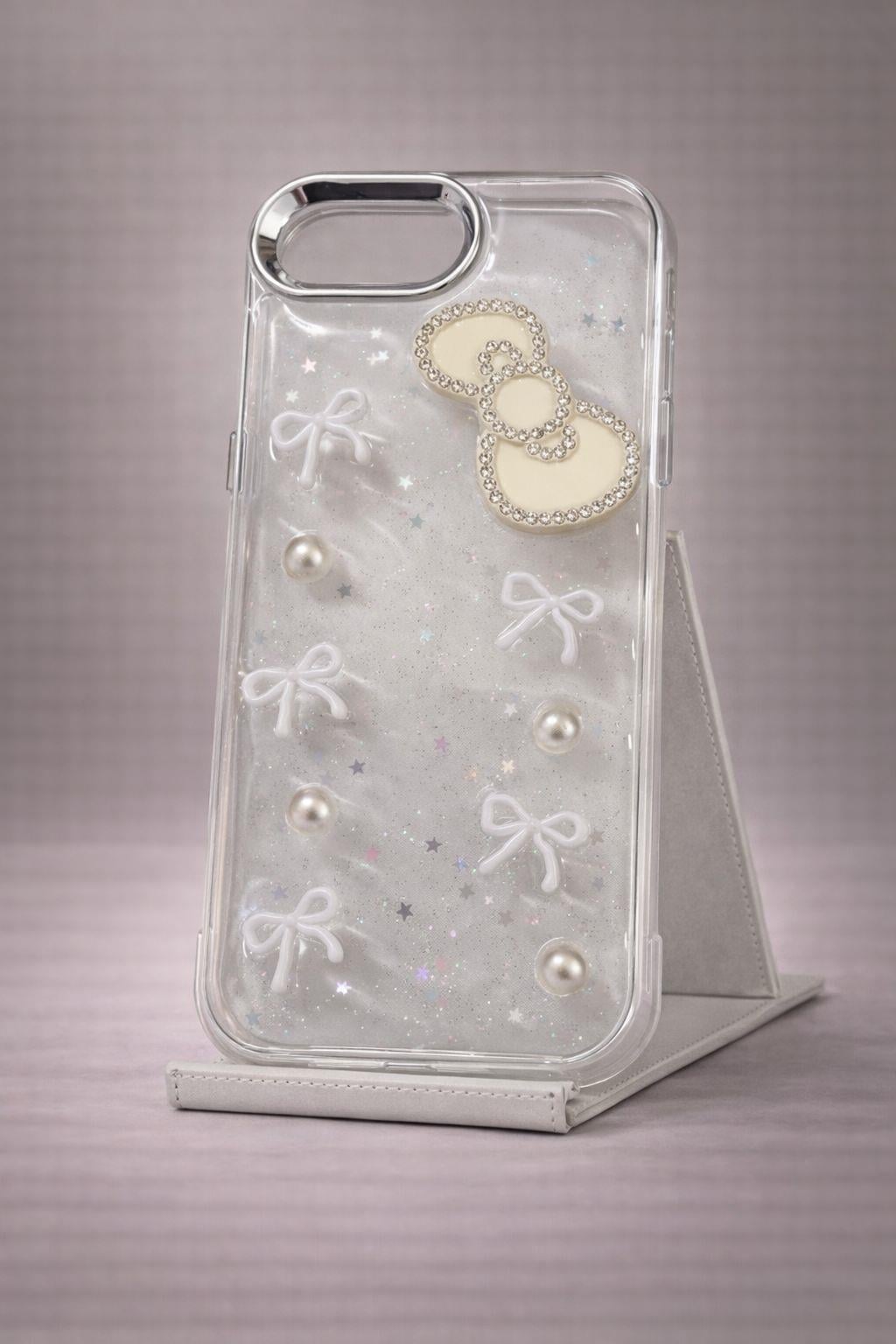 İphone 16 E Uyumlu Kurdeleli ve İnci Taşlı Kılıf Beyaz