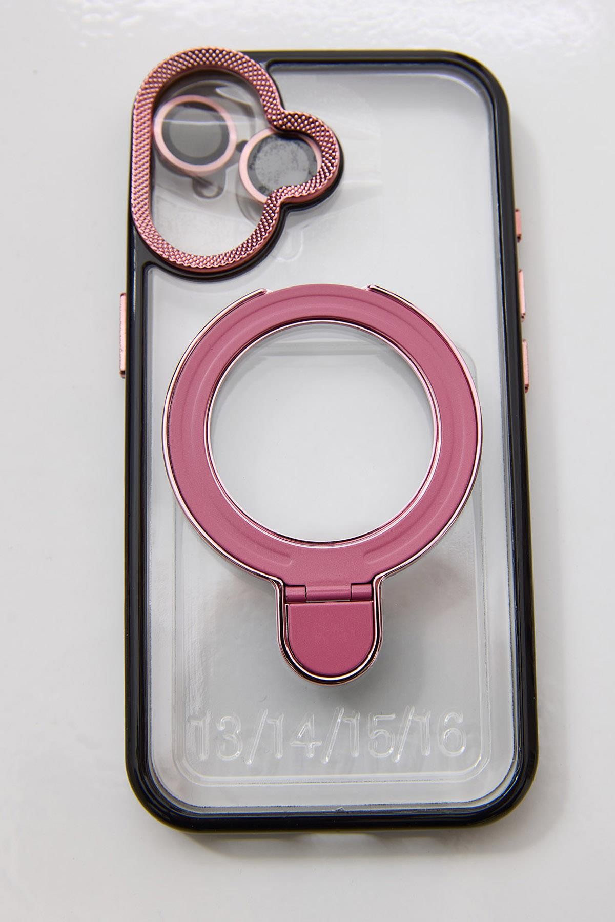 İphone 16 Plus Uyumlu Stand Tutucu Halka Şeffaf Telefon Kılıfı Pembe