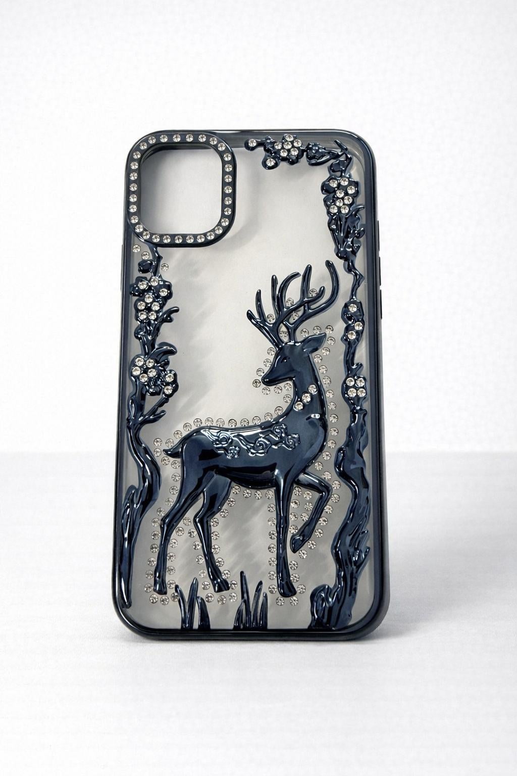 İphone 16 Pro Uyumlu Geyik ve Çiçek Kabartmalı Kılıf Lacivert (300643KLXLACİ)