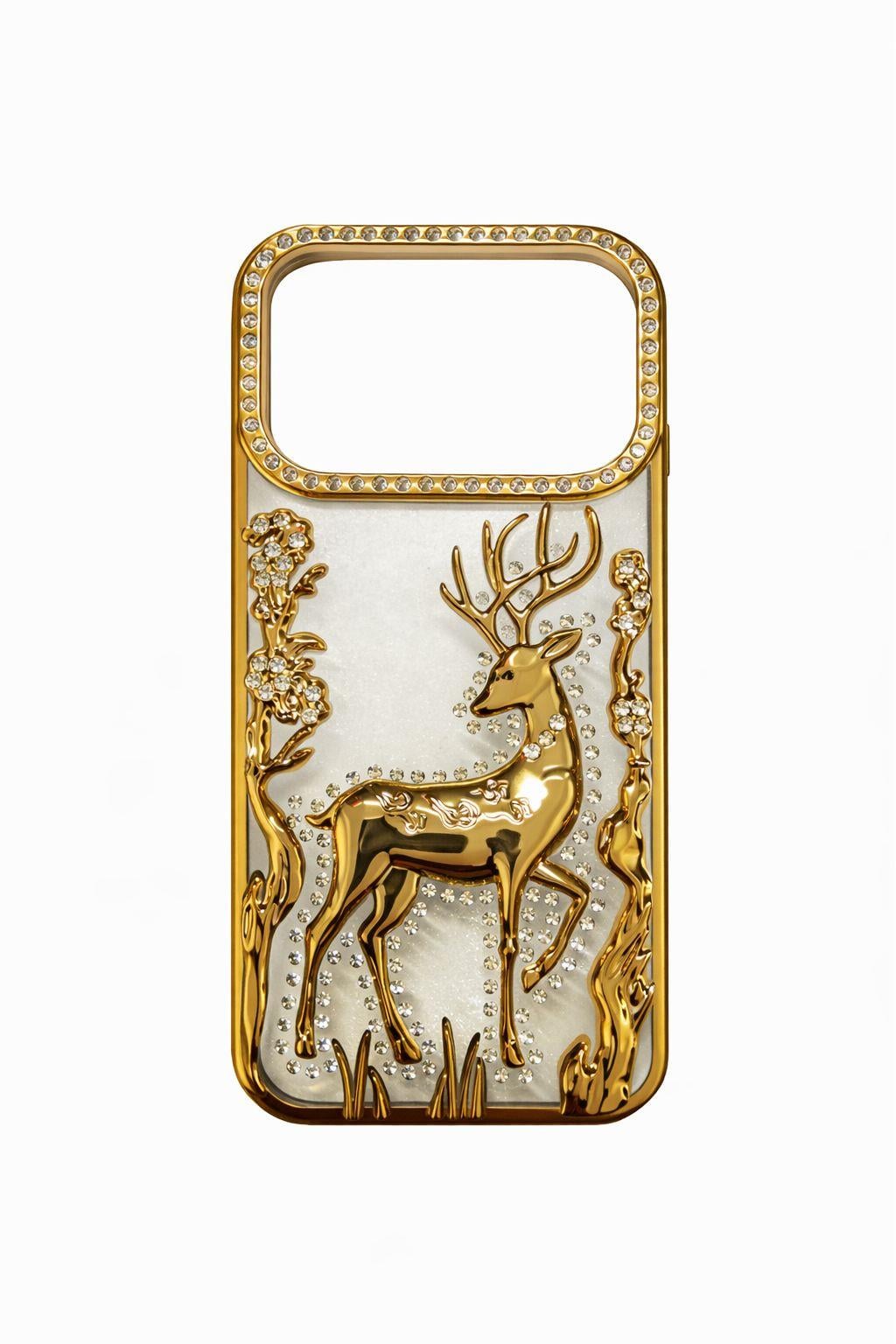 İphone 17 Pro Max Uyumlu Geyik ve Çiçek Kabartmalı Kılıf Gold
