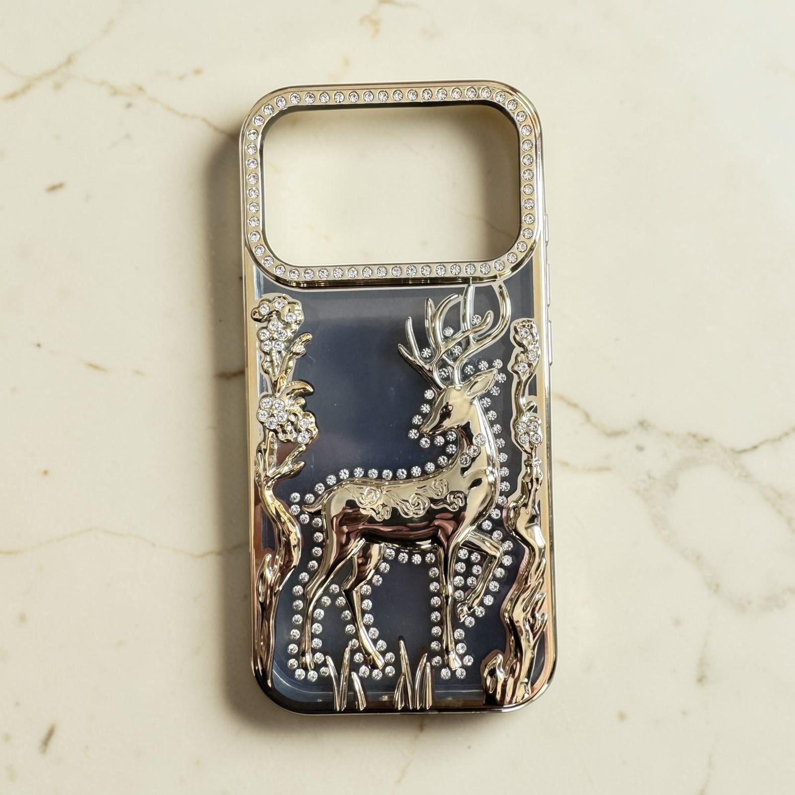 İphone 17 Pro Uyumlu Geyik ve Çiçek Kabartmalı Kılıf Gold