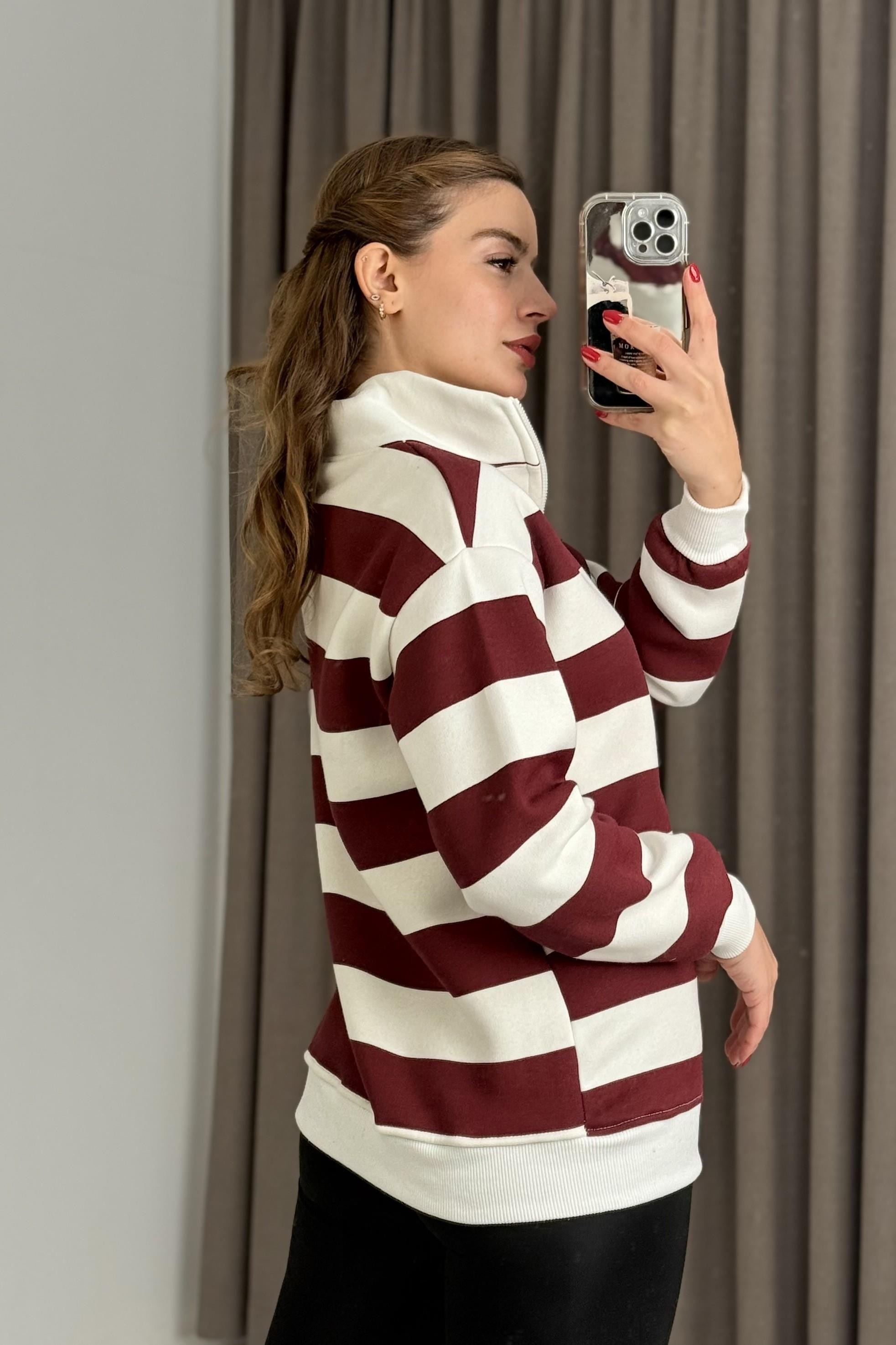 Kadın Balıkçı Yaka Çizgili Üç İplik İçi Şardonlu Kışlık Sweatshırt Bordo (500335SWTXBRD)