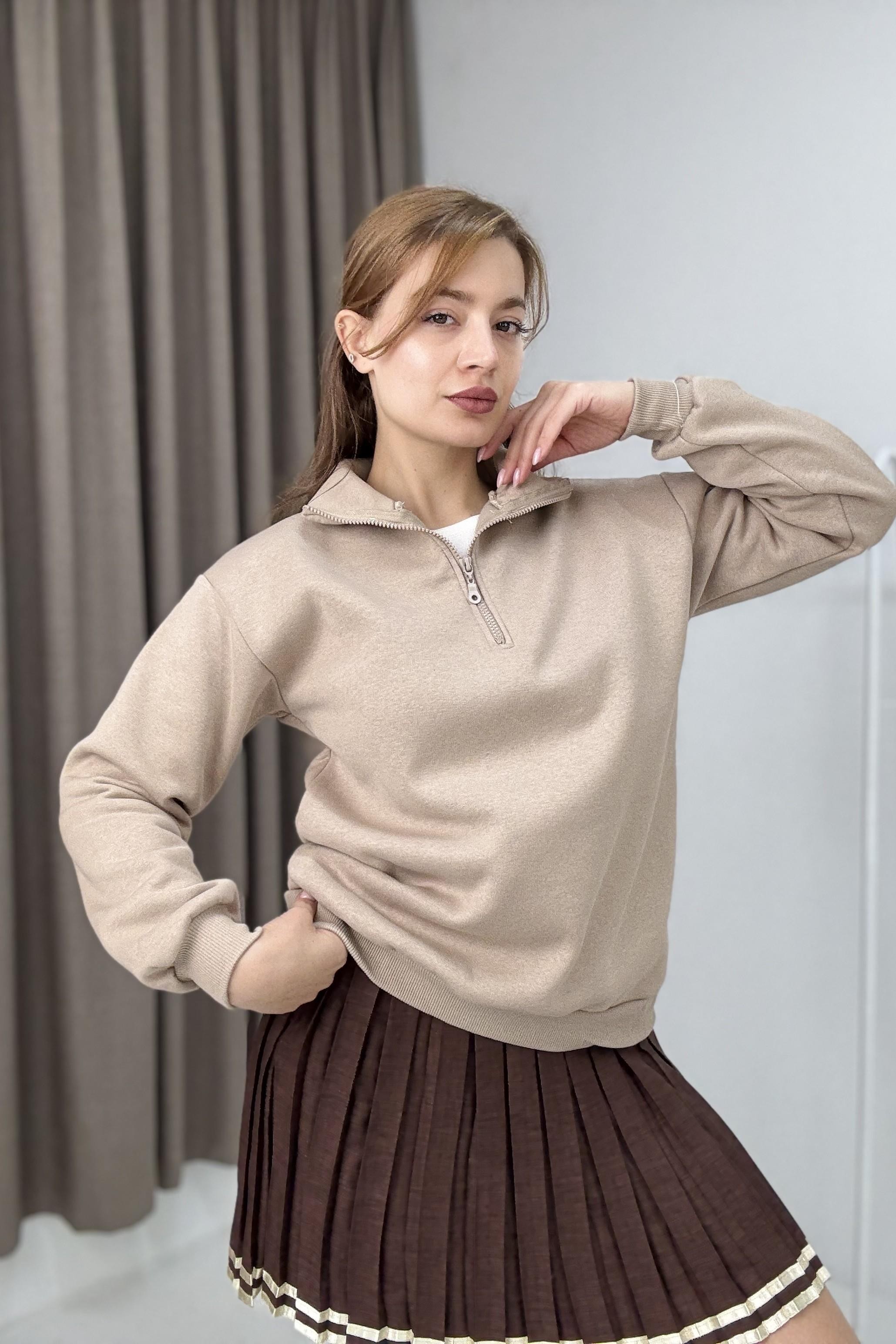 Kadın Bej Yarım Fermuarlı Üç İplik Sweat (600136SWTXBEJ)