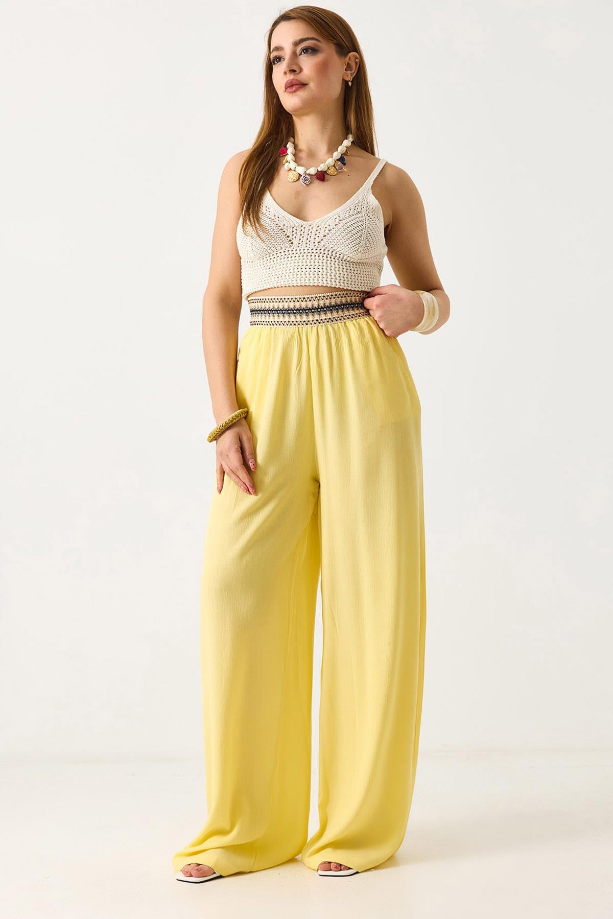 Kadın Beli Etnik Desen Keten Salaş Pantolon Sarı (600701PNTXSRI)
