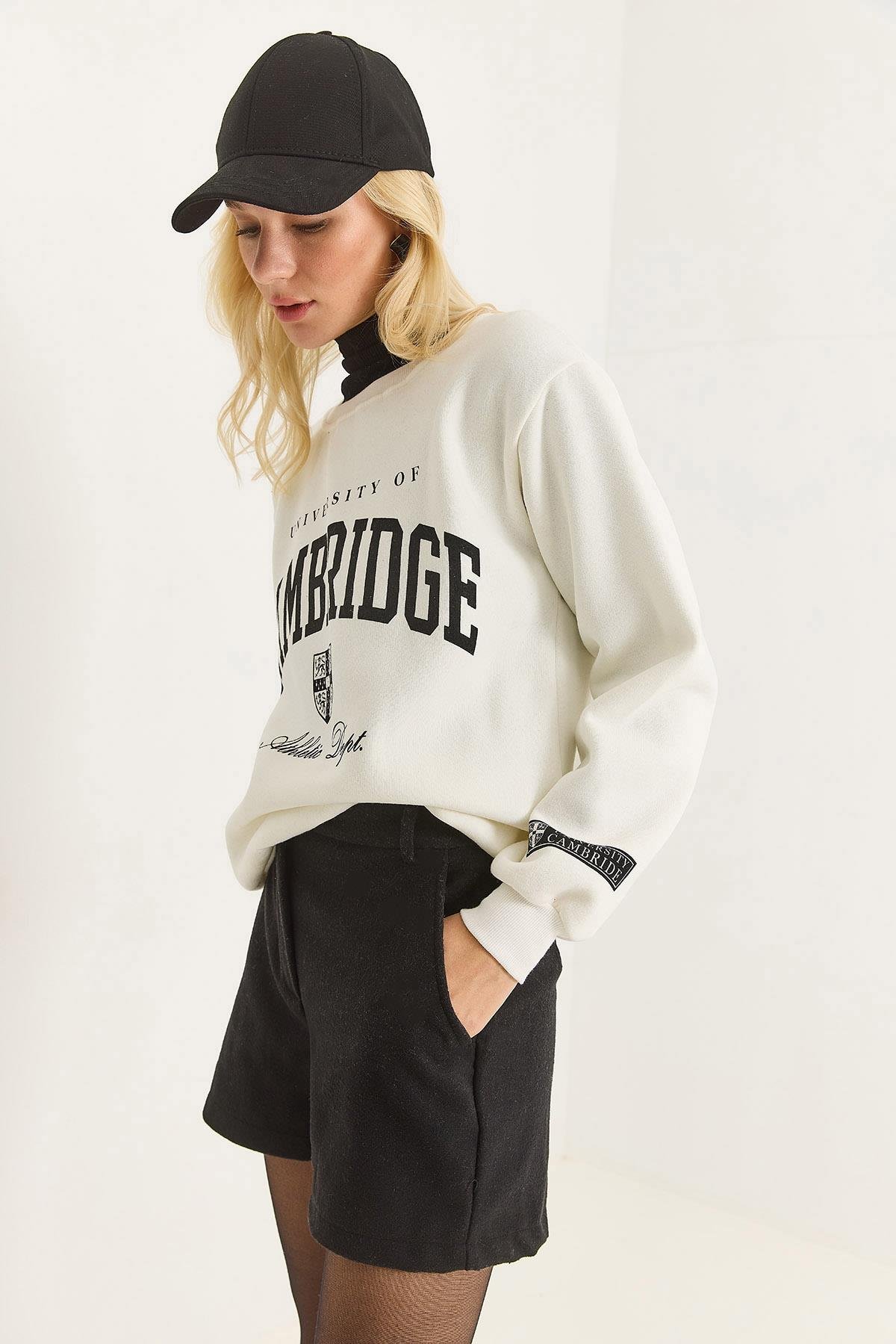 Kadın Bisiklet Yaka Baskılı Üç İplik Şardonlu Sweatsirt Beyaz