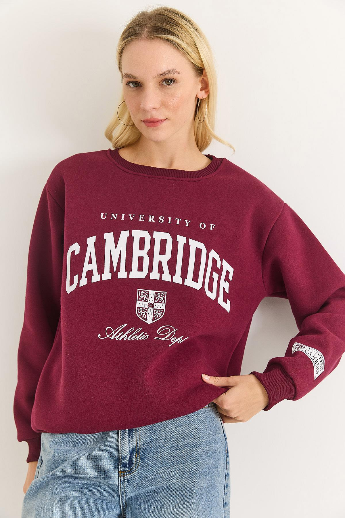 Kadın Bisiklet Yaka Baskılı Üç İplik Şardonlu Sweatsirt Bordo (500817SWTXBRD)