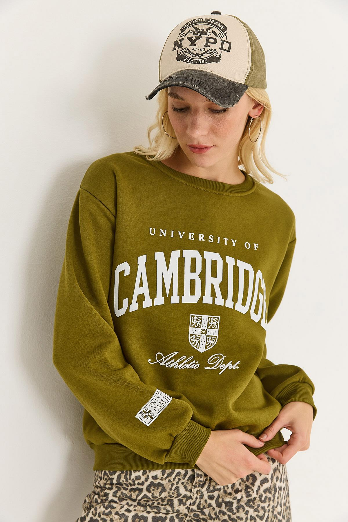 Kadın Bisiklet Yaka Baskılı Üç İplik Şardonlu Sweatsirt Yeşil (500817SWTXYŞL)