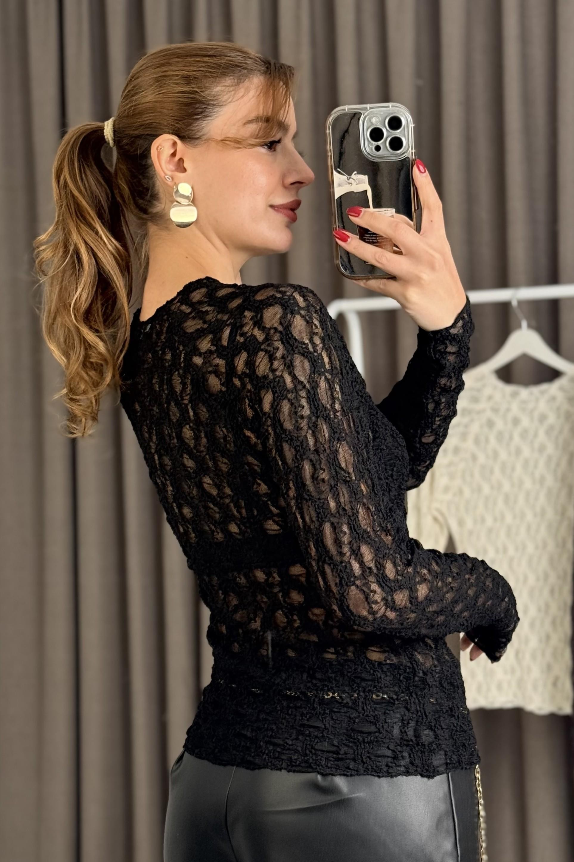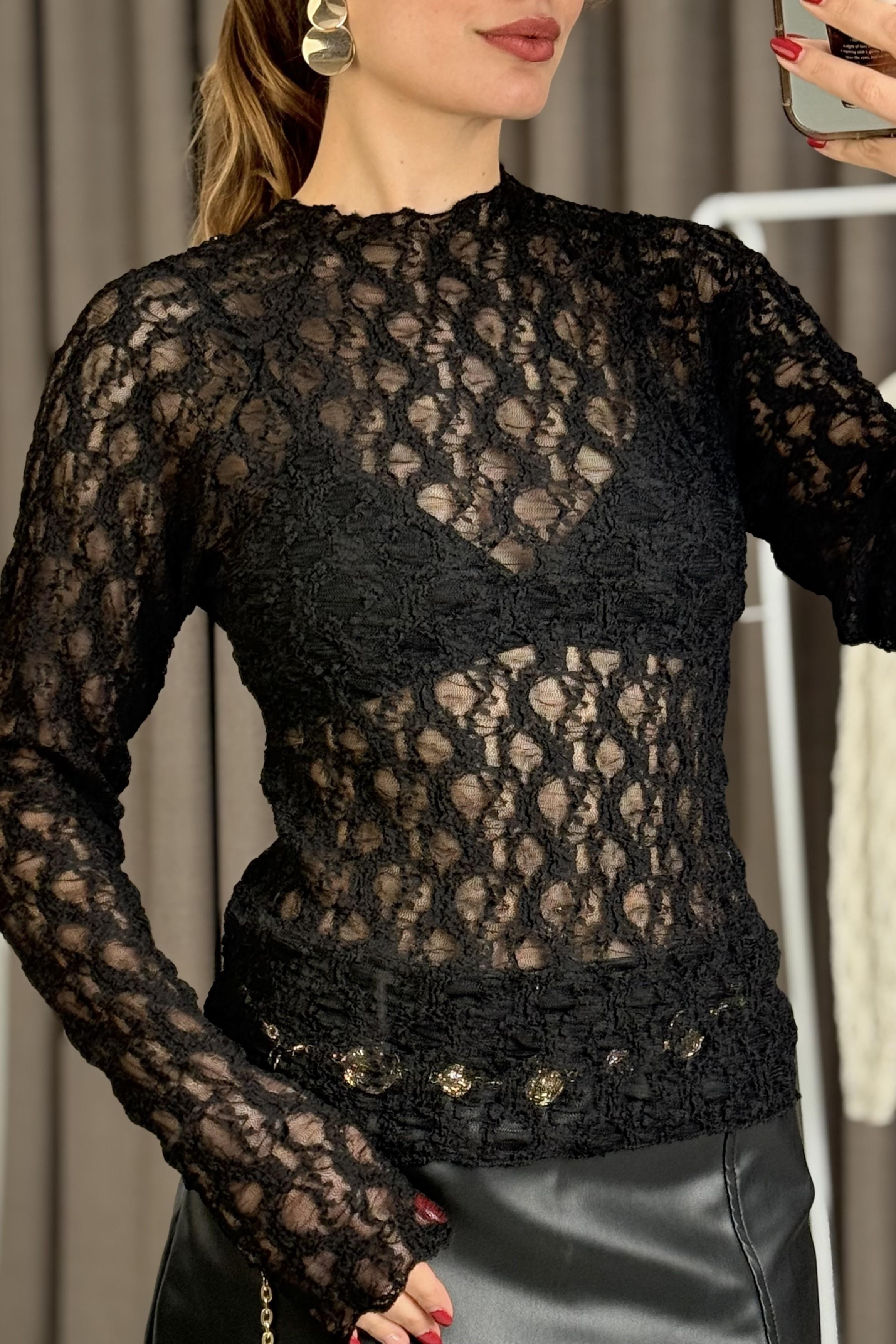 Kadın Bisiklet Yaka Dantel Transparan Bluz Siyah